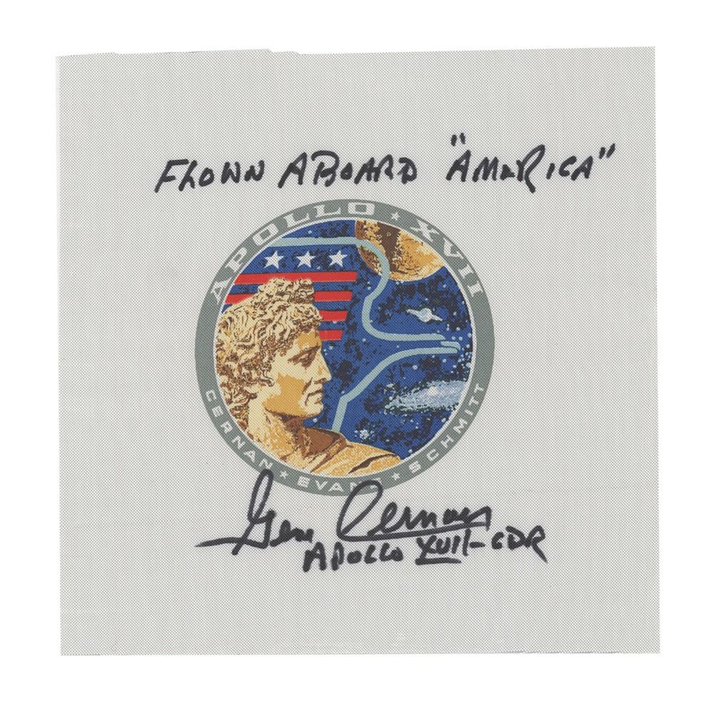 Flown Beta cloth patch of the Apollo 17 mission insignia, 7 x 7, carried into lunar orbit aboard the Command Module America during the final Apollo moon-landing mission, signed and flight-certified in black felt tip, "Flown aboard 'America,' Gene Cernan, Apollo XVII–CDR." In fine condition.
