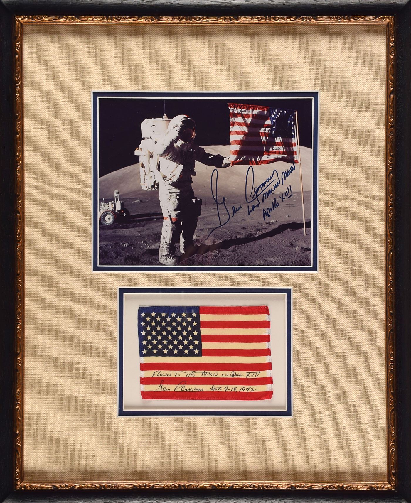 Highly desirable flown fabric American flag, 5.75 x 4, carried into lunar orbit during the Apollo 17 mission, signed and flight-certified in thin black felt tip, "Flown to the moon on Apollo XVII, Gene Cernan, Dec. 7–19, 1972." Also included is a color glossy 9.25 x 7.25 photo of the Apollo 17 commander holding and saluting the American flag on the lunar surface, signed in blue felt tip, "Gene Cernan, Last man on moon, Apollo XVII." Both are attractively framed together with UV-resistant glass and acid-free matting to an overall size of 17.75 x 21.75. In fine condition, with an even block of toning to the flag.