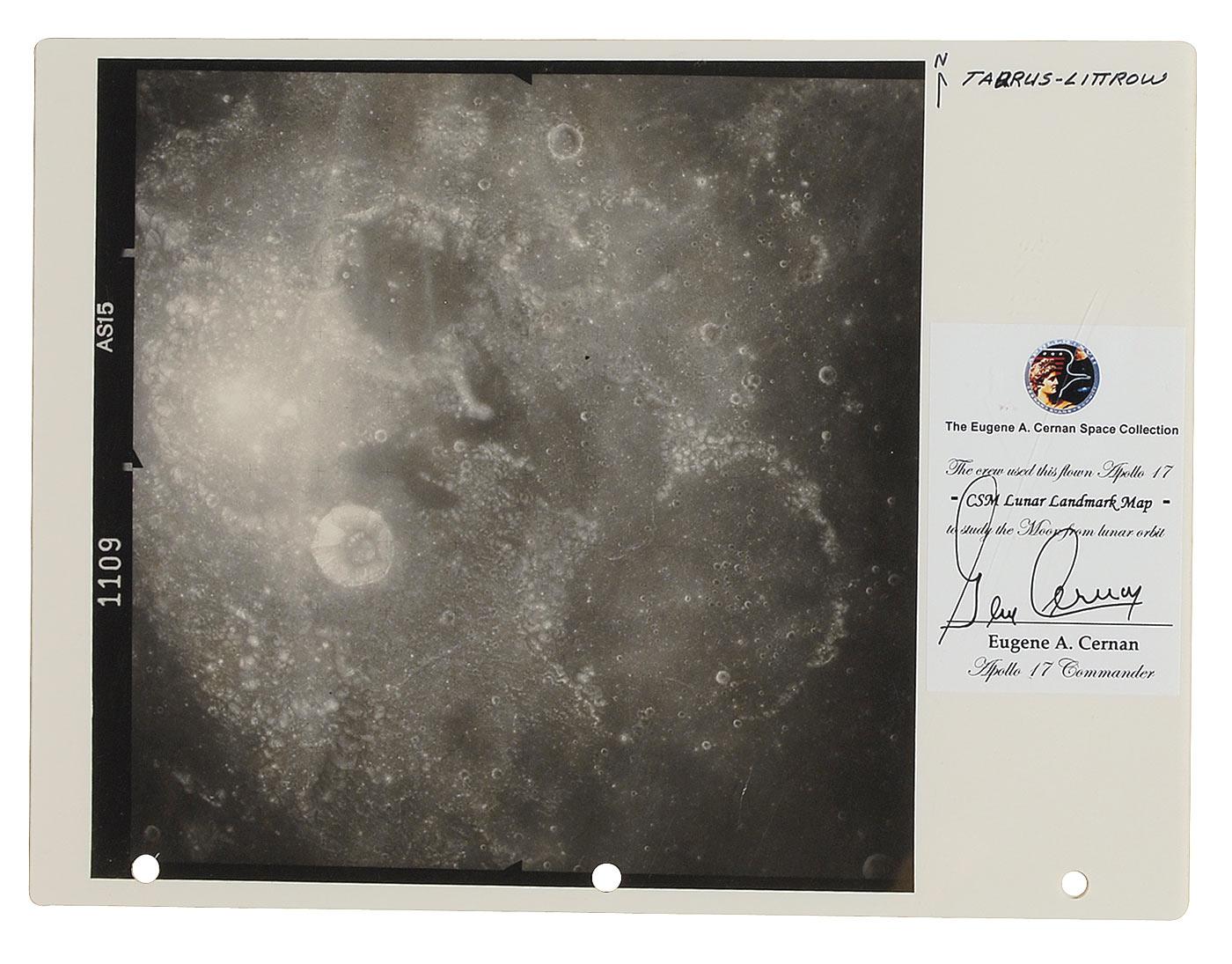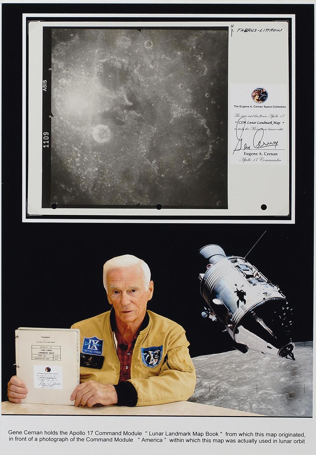 Flight-flown Apollo 17 ‘Lunar Landmark’ map, 10.5 x 8, used in lunar orbit during the Apollo 17 mission. Map shows a portion of the lunar surface, labeled at the top, “Taurus-Littrow,” and shows a crystal-clear image of the region on the lunar surface including the mission’s landing site. This map originates from the personal space collection of Gene Cernan, and bears his personal signed flight-certification label to the right border of the map. Map is removably presented on a 13 x 19 color display picturing Cernan holding the ‘Lunar Landmark Book’ which this map came from. In fine condition, with three punch holes to bottom edge of map.