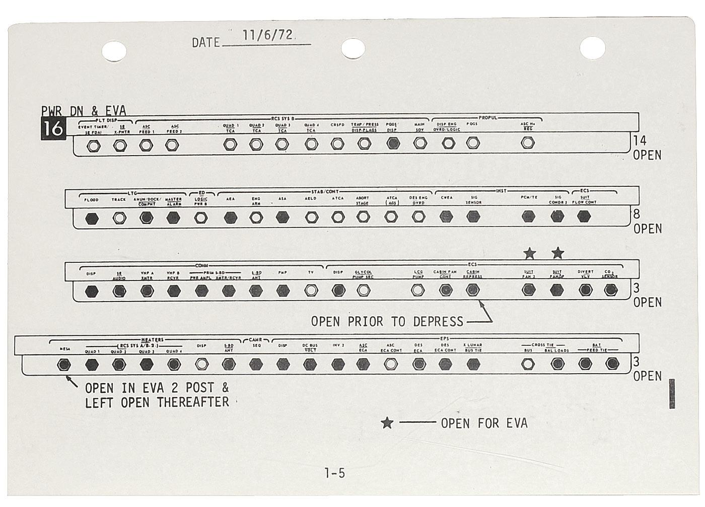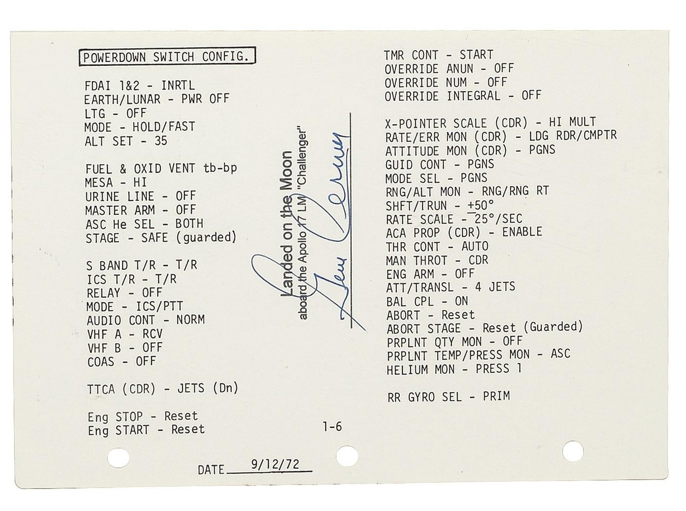 Double-sided flight-flown checklist page, 8 x 5.5, from the Apollo 17 LM ‘Lunar-Surface Checklist’ used on the lunar surface. This particular leaf bears page numbers 1-5 and 1-6, and details procedures to be used shortly after the lunar module landed on the surface of the moon. Page 1-5 is also one of the few checklist pages to actually display the circuit breaker configuration as it was set during that time. The page bears Gene Cernan’s signed flight certification stamp attesting to the fact this page was on the moon aboard the LM “Challenger.” Removably presented on a 13 x 19 color presentation bearing a photograph of Cernan holding the complete check list from which this page originated. In fine condition, with three punch holes to bottom edge.