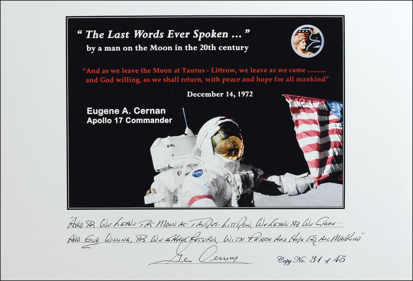 Color very limited edition 19 x 13 manuscript print entitled “The Last Words Ever Spoken,” numbered #31/45, bearing an image of Cernan on the lunar surface and a printed quotation of his last words spoken on the moon, signed in black felt tip underneath the image, with Cernan writing out the final words ever spoken by man on the moon: “And as we leave the Moon at ‘Taurus—Littrow,’ we leave as we came…and God willing, as we shall return, with peace and hope for all mankind,” and signed underneath, “Gene Cernan.” In fine condition. In the years since leaving the moon, Cernan has rarely inscribed this quote in full, and as such few examples exist. This copy is one of only 45 examples that were created, and one of only 36 authorized for sale to collectors by Cernan.