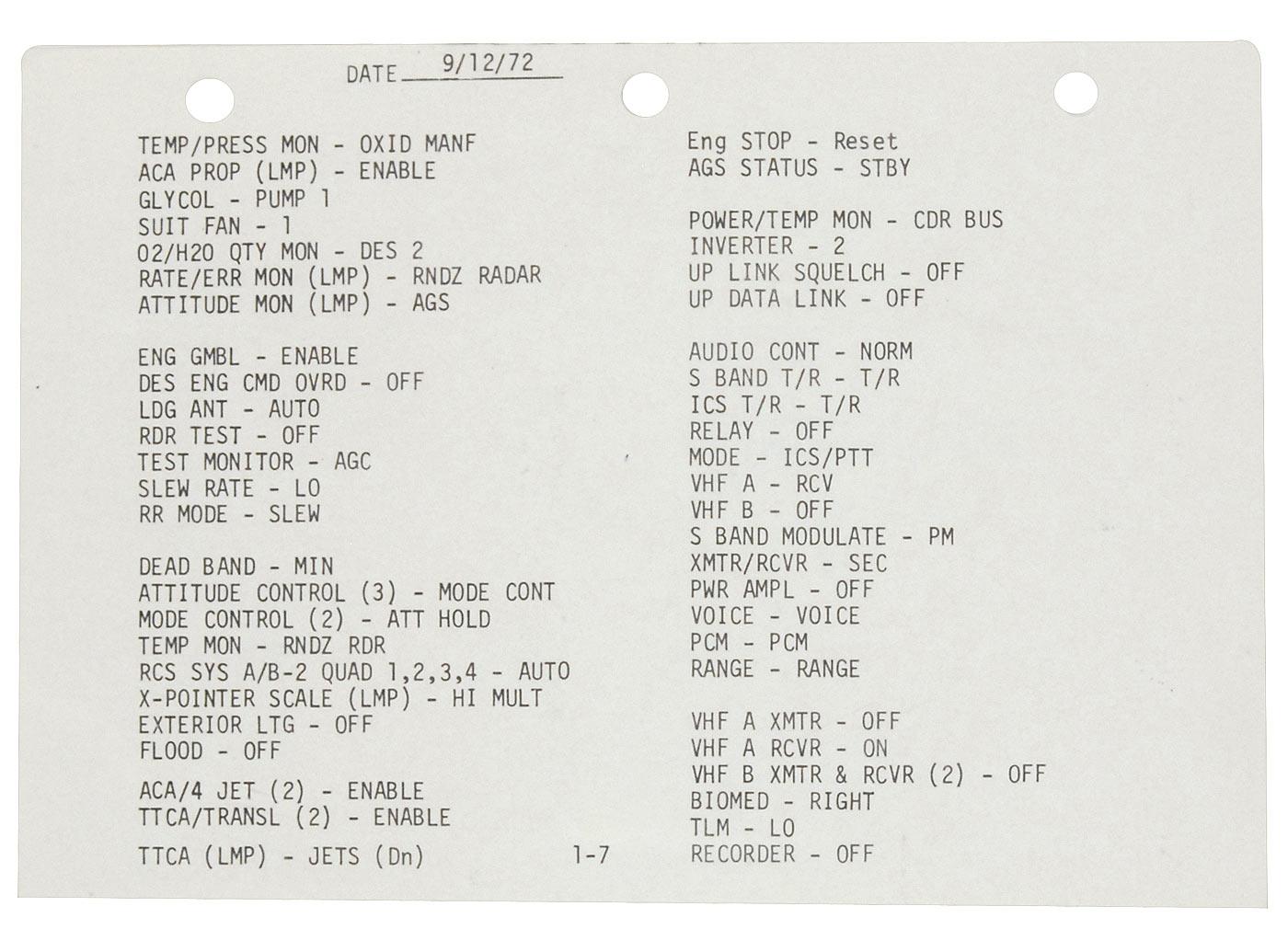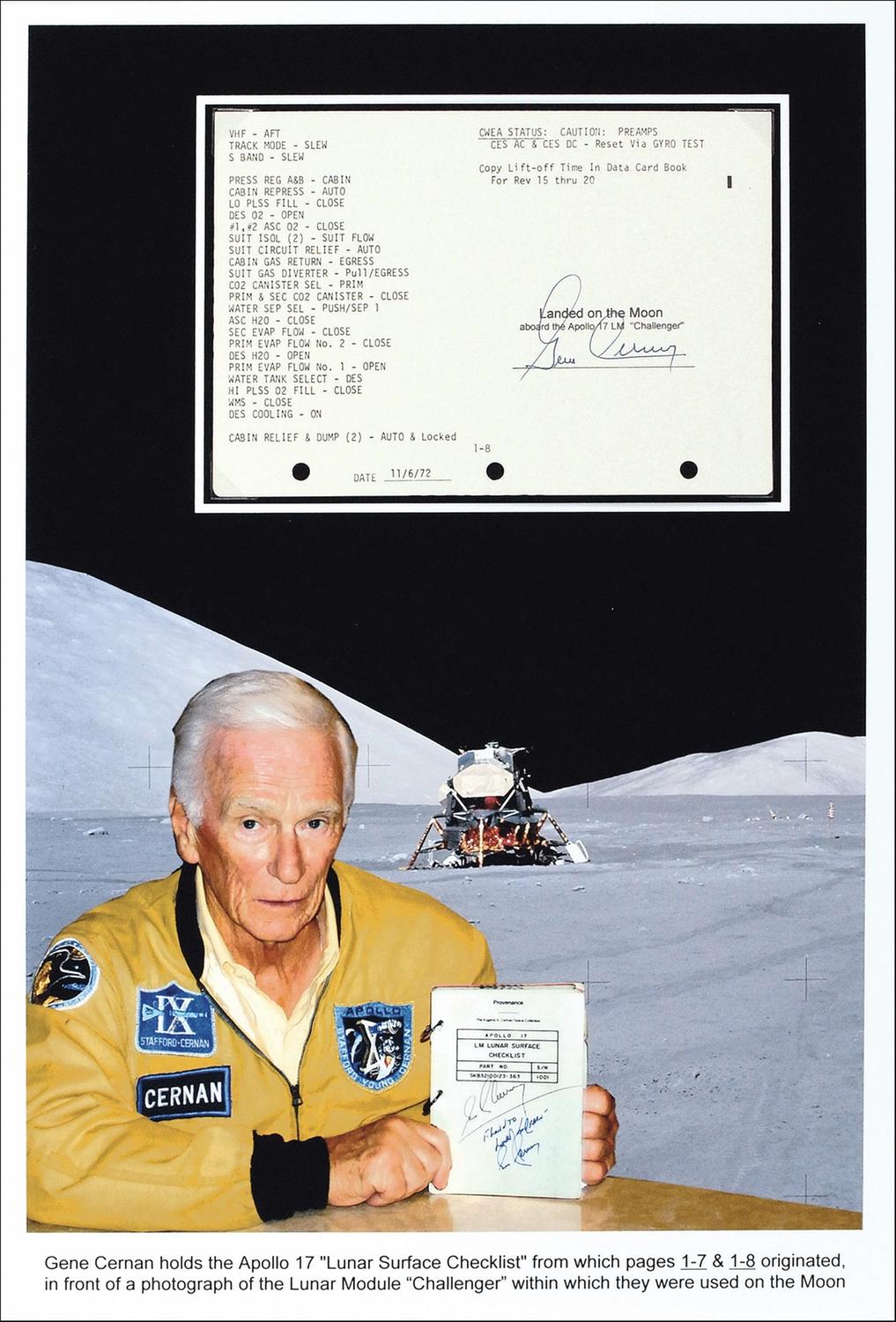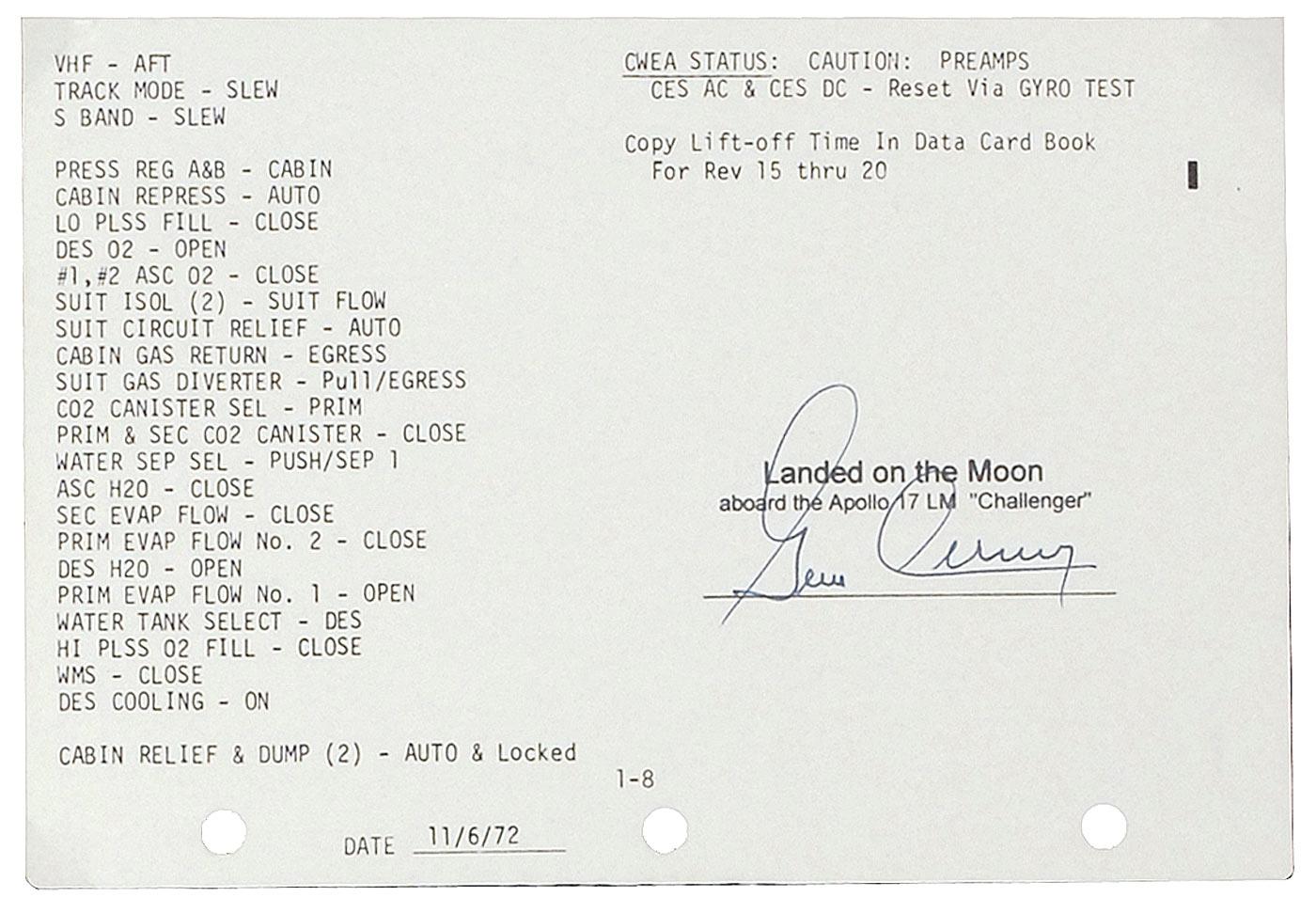 Double-sided flight-flown checklist page, 8 x 5.5, from the Apollo 17 LM ‘Lunar-Surface Checklist’ used on the lunar surface. This particular leaf bears page numbers 1-7 and 1-8, and details procedures to be used shortly after the lunar module landed on the surface of the moon. Page 1-8 bears a heading which reads, “Copy Lift-Off time in data card book for Rev 15 thru 20.” The page bears Gene Cernan’s signed flight certification stamp attesting to the fact this page was on the moon aboard the LM “Challenger.” Removably presented on a 13 x 19 color presentation bearing a photograph of Cernan holding the complete check list from which this page originated. In fine condition, with three punch holes to bottom edge.