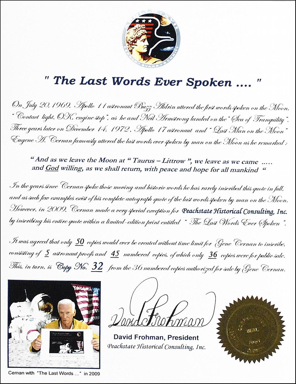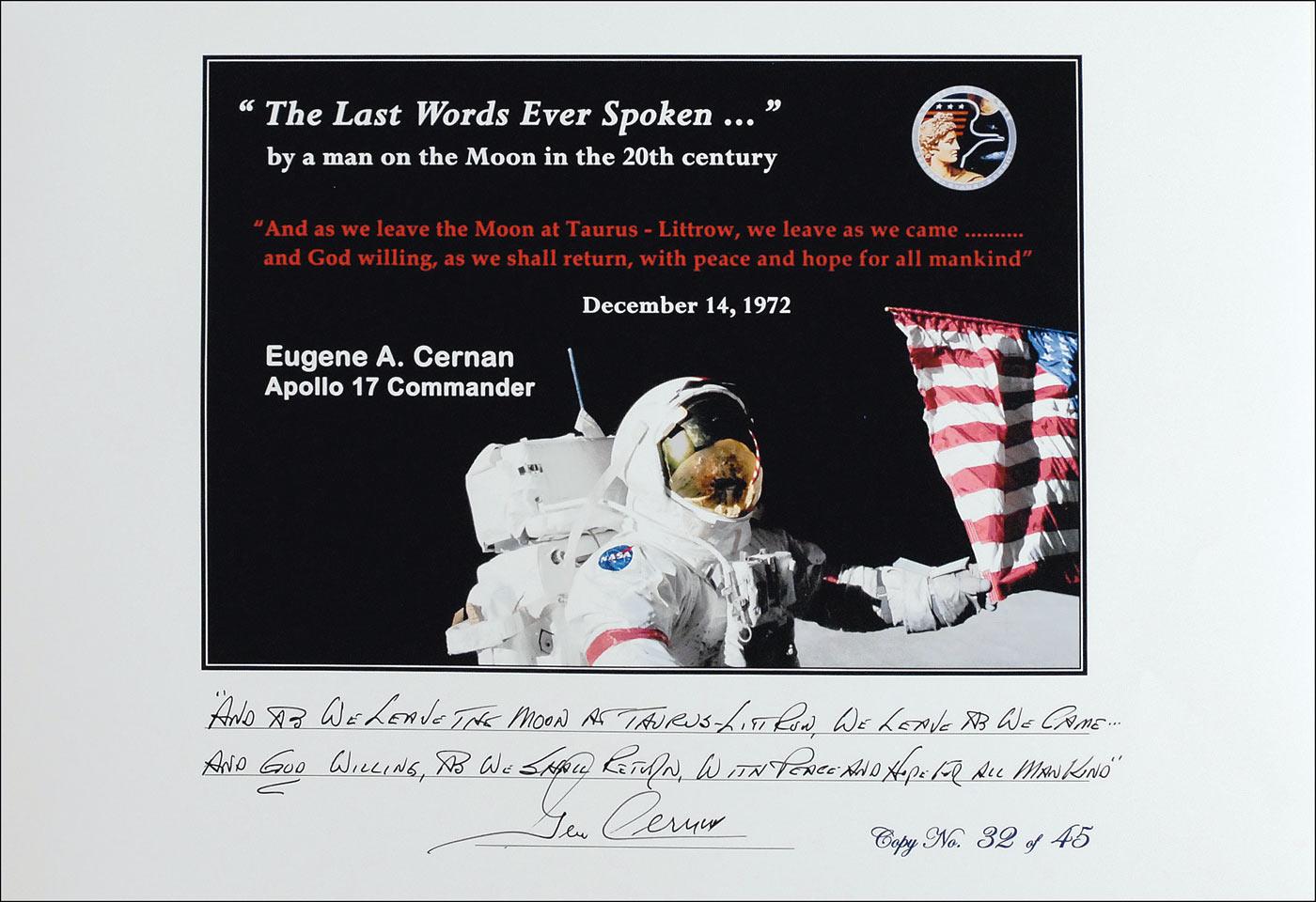 Color very limited edition 19 x 13 manuscript print entitled “The Last Words Ever Spoken,” numbered #32/45, bearing an image of Cernan on the lunar surface and a printed quotation of his last words spoken on the moon, signed in black felt tip underneath the image, with Cernan writing out the final words ever spoken by man on the moon: “And as we leave the Moon at ‘Taurus—Littrow,’ we leave as we came…and God willing, as we shall return, with peace and hope for all mankind,” and signed underneath, “Gene Cernan.” In fine condition. In the years since leaving the moon, Cernan has rarely inscribed this quote in full, and as such few examples exist. This copy is one of only 45 examples that were created, and one of only 36 authorized for sale to collectors by Cernan.