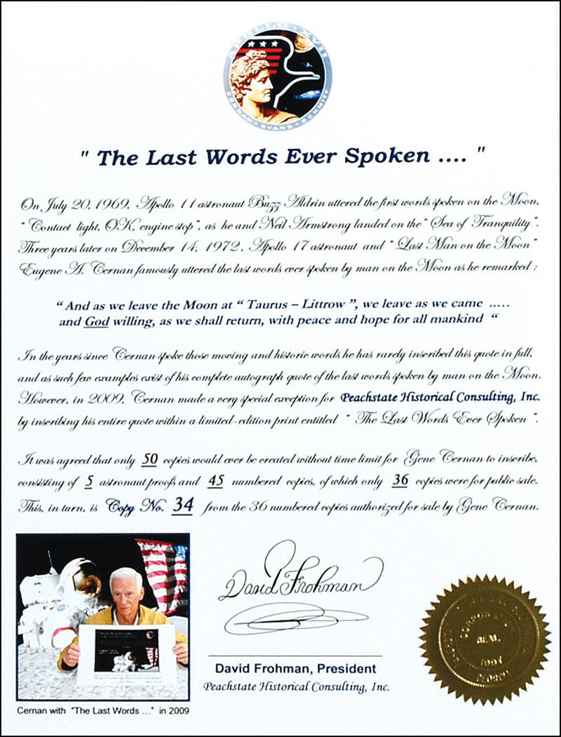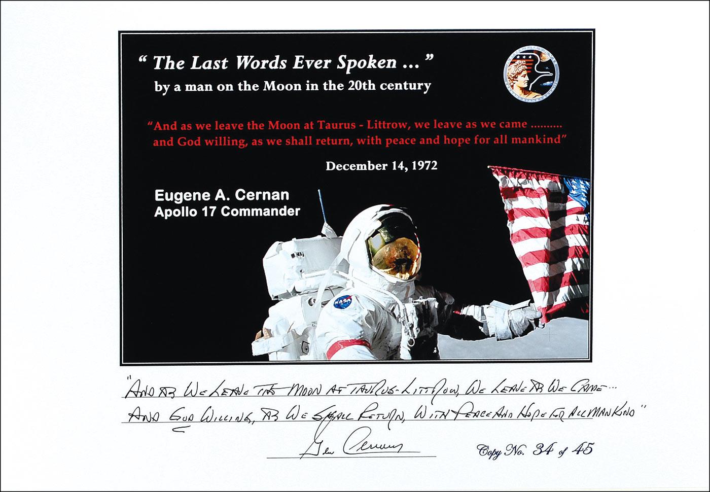 Color very limited edition 19 x 13 manuscript print entitled “The Last Words Ever Spoken,” numbered #34/45, bearing an image of Cernan on the lunar surface and a printed quotation of his last words spoken on the moon, signed in black felt tip underneath the image, with Cernan writing out the final words ever spoken by man on the moon: “And as we leave the Moon at ‘Taurus—Littrow,’ we leave as we came…and God willing, as we shall return, with peace and hope for all mankind,” and signed underneath, “Gene Cernan.” In fine condition. In the years since leaving the moon, Cernan has rarely inscribed this quote in full, and as such few examples exist. This copy is one of only 45 examples that were created, and one of only 36 authorized for sale to collectors by Cernan.