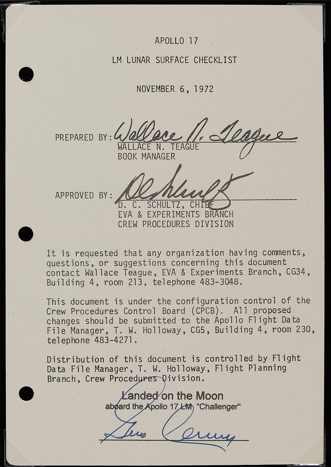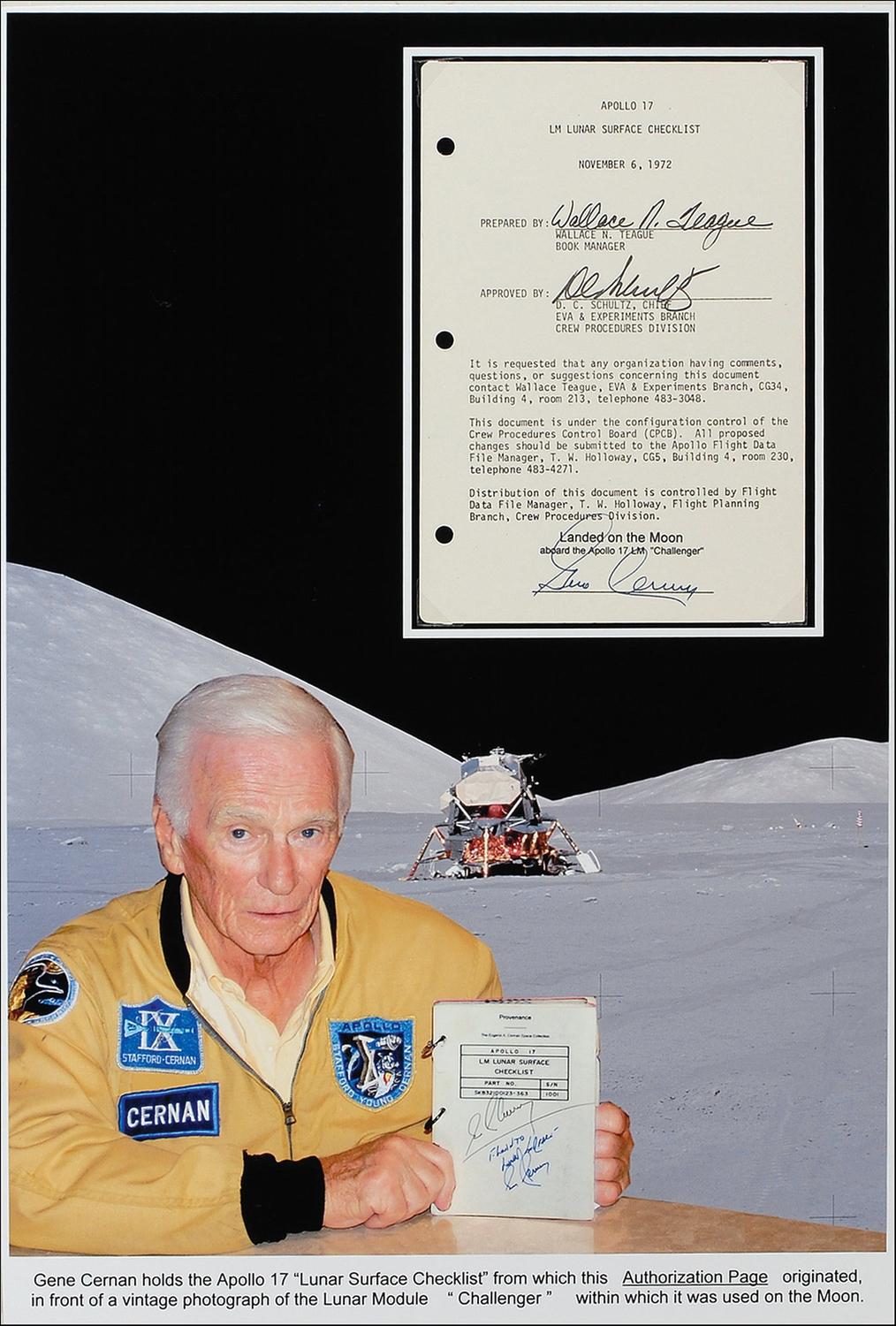 The accompanying document represents the actual "Authorization" page for the Apollo 17 Lunar Surface Checklist. It was removed from the front of the flown checklist, within which it spent three remarkable days on the surface of the Moon. The page measures 5.5 by 8 inches and is dated November 6, 1972, and also bears Cernan's signed flight-certification stamp. Removably-affixed to a deluxe 13 by 19 inch presentation mount bearing a portrait of Cernan holding the checklist from which this page originated. In fine condition, with three punch holes to the top edge. An astonishingly unique piece of NASA history…direct from the moon!