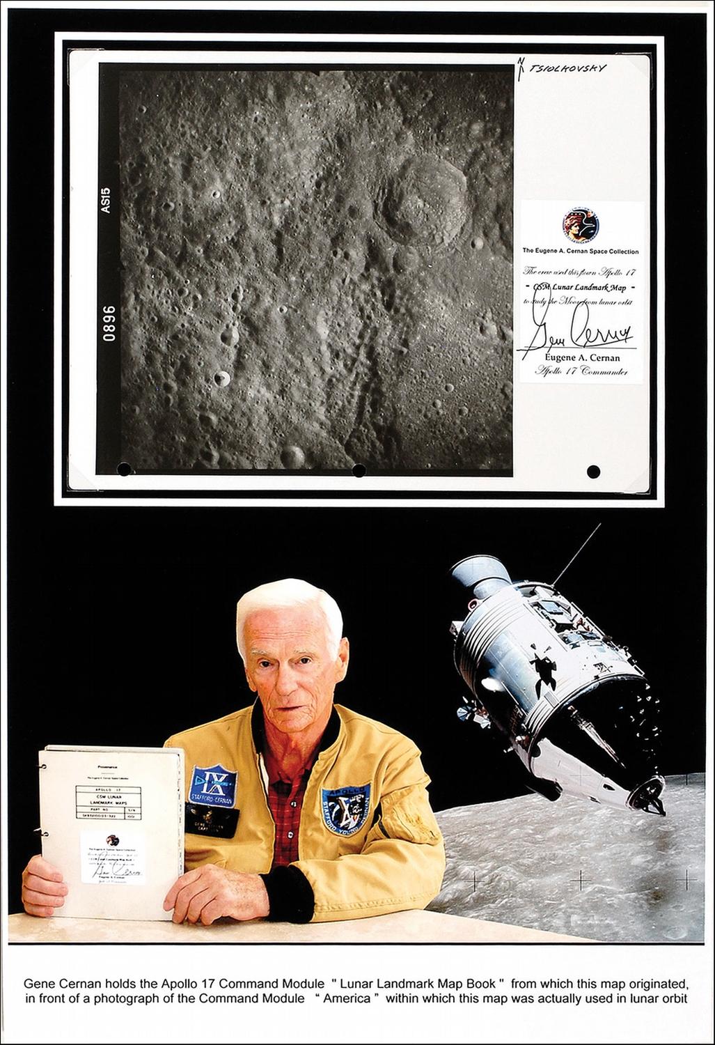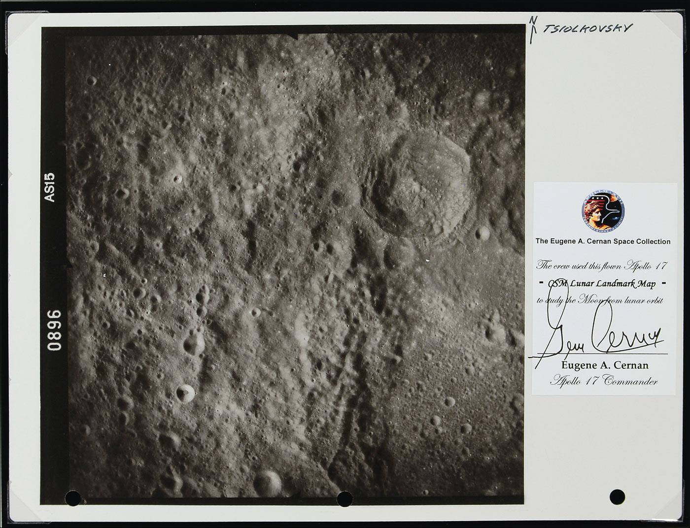 Flight-flown Apollo 17 ‘Lunar Landmark’ map, 10.5 x 8, used in lunar orbit during the Apollo 17 mission. Map shows a portion of the lunar surface, labeled at the top, “Tsiolkovsky,” and shows a crystal-clear image of the region on the lunar surface. This map originates from the personal space collection of Gene Cernan, and bears his personal signed flight-certification label to the right border of the map. Map is removably presented on a 13 x 19 color display picturing Cernan holding the ‘Lunar Landmark Book’ which this map came from. In fine condition, with three punch holes to bottom edge of map. Named after Russian rocket scientist Konstantin Tsiolkovsky, the Tsiolkovsky crater is the most prominent crater on the far side of the Moon. Flown artifacts from any Apollo mission are highly desirable.