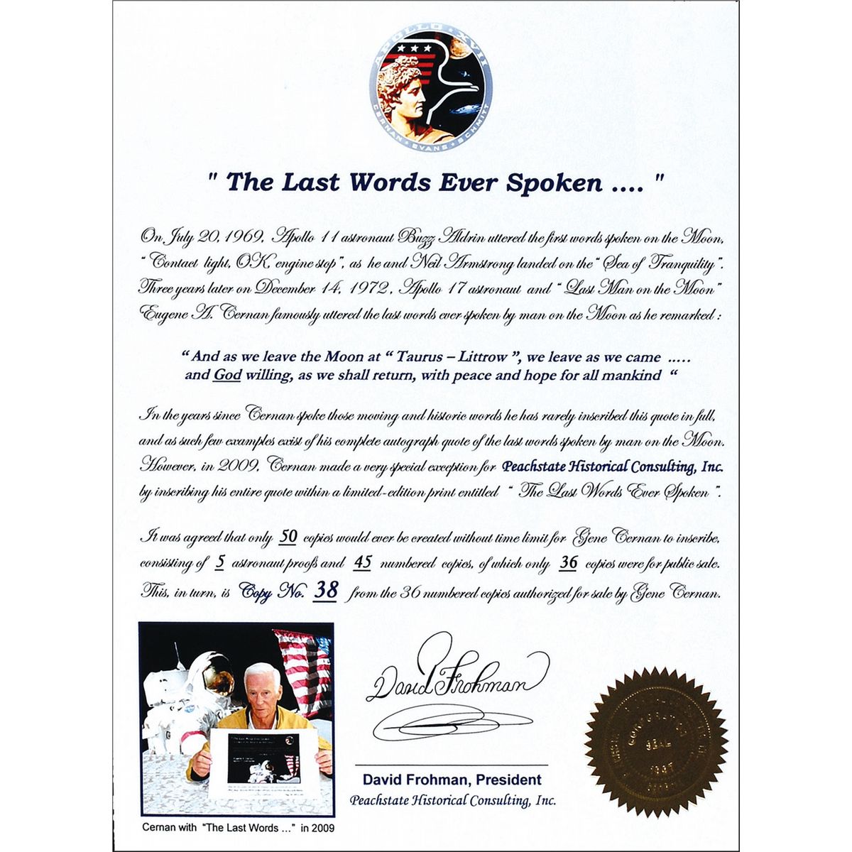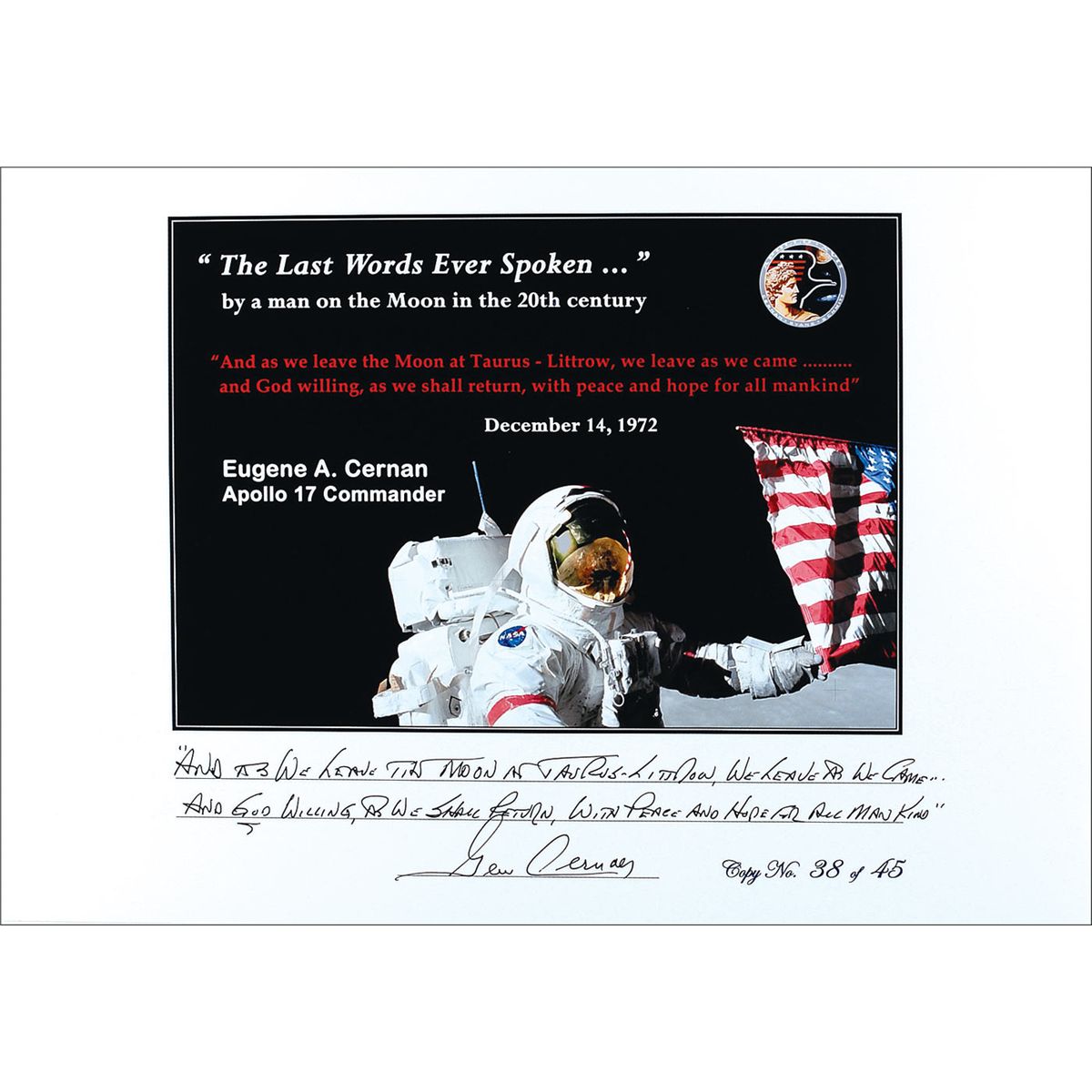 Color very limited edition 19 x 13 manuscript print entitled “The Last Words Ever Spoken,” numbered #38/45, bearing an image of Cernan on the lunar surface and a printed quotation of his last words spoken on the moon, signed in black felt tip underneath the image, with Cernan writing out the final words ever spoken by man on the moon: “And as we leave the Moon at ‘Taurus—Littrow,’ we leave as we came…and God willing, as we shall return, with peace and hope for all mankind,” and signed underneath, “Gene Cernan.” In fine condition. In the years since leaving the moon, Cernan has rarely inscribed this quote in full, and as such few examples exist. This copy is one of only 45 examples that were created, and one of only 36 authorized for sale to collectors by Cernan.