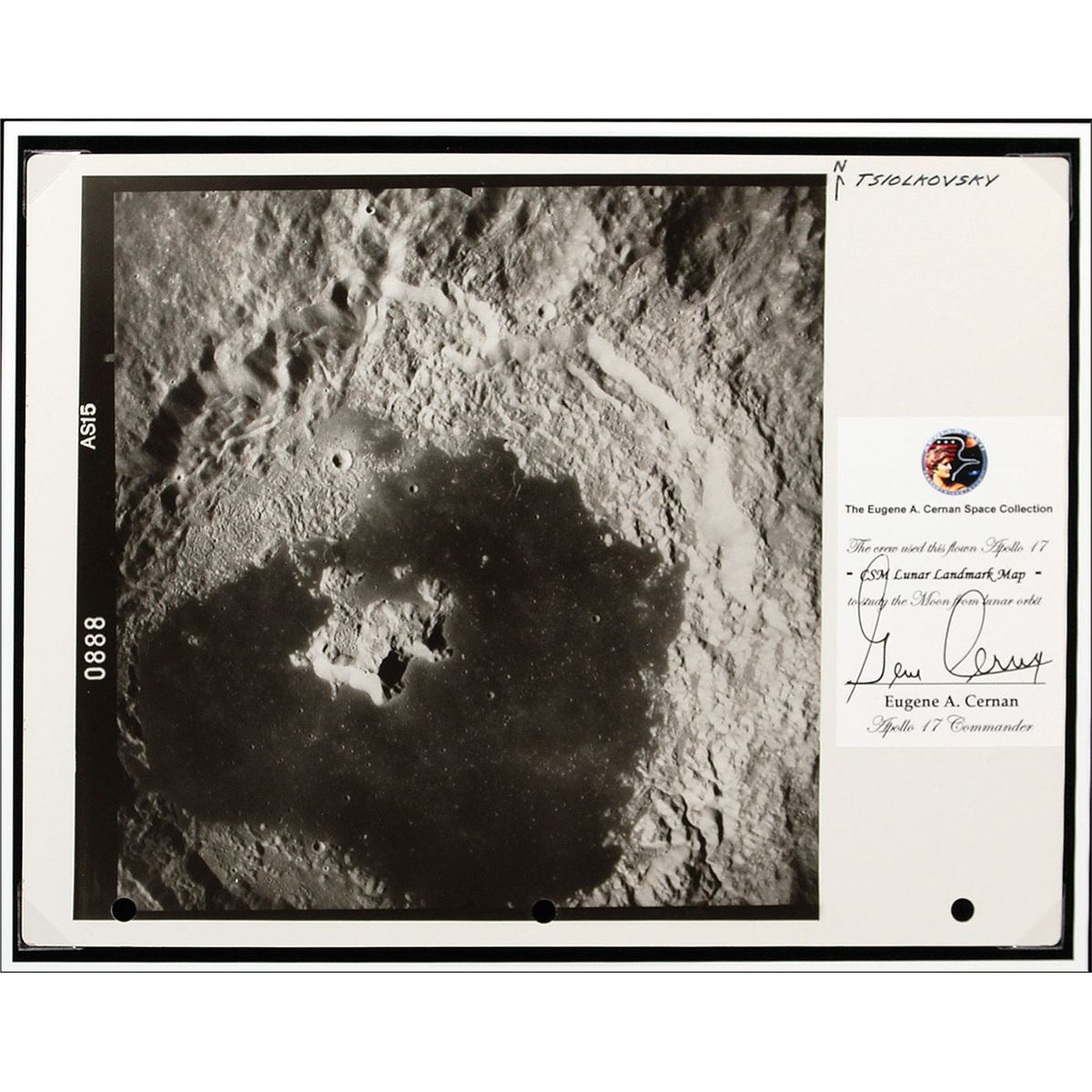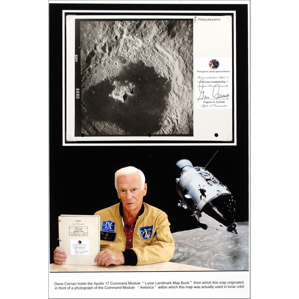 Flight-flown Apollo 17 ‘Lunar Landmark’ map, 10.5 x 8, used in lunar orbit during the Apollo 17 mission. Map shows a portion of the lunar surface, labeled at the top, “Tsiolkovsky,” and shows a crystal-clear image of the region on the lunar surface. This map originates from the personal space collection of Gene Cernan, and bears his personal signed flight-certification label to the right border of the map. Map is removably presented on a 13 x 19 color display picturing Cernan holding the ‘Lunar Landmark Book’ which this map came from. In fine condition, with three punch holes to bottom edge of map. Named after Russian rocket scientist Konstantin Tsiolkovsky, the Tsiolkovsky crater is the most prominent crater on the far side of the Moon. Flown artifacts from any Apollo mission are highly desirable.