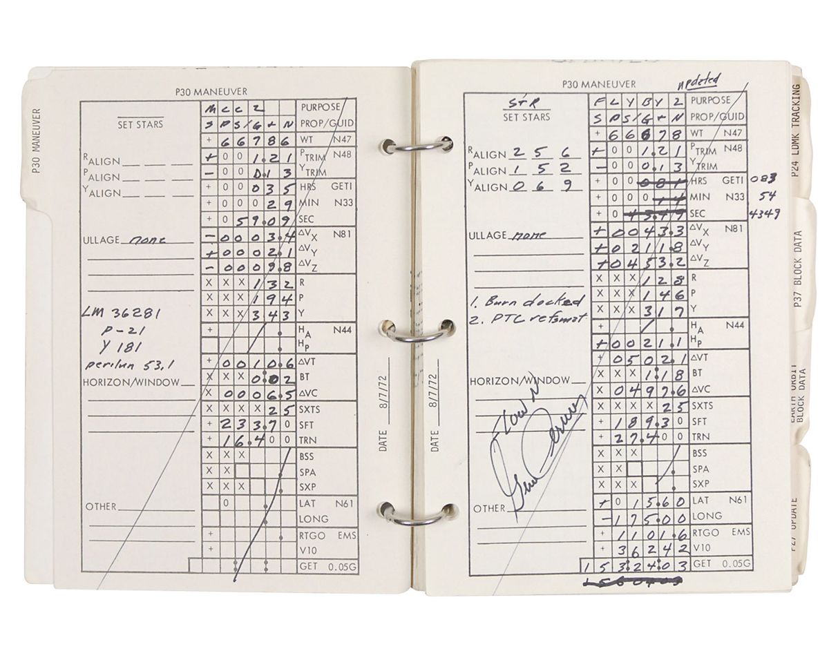 Complete flown Command Service Module Updates checklist carried aboard Apollo 17, used by the entire crew and heavily annotated by Harrison Schmitt or Ron Evans. Checklist consists of 53 heavy cardstock 6 x 8 pages (including covers) bound by 3 metal rings, titled on the front, “Apollo 17, CSM Updates, Part No. SKB32100123–330, S/N 1001,” and boldly certified and signed on the cover by Cernan in blue felt tip, “Flown on Apollo XVII, Gene Cernan.” Of the 51 pages within the checklist, there are 25 pages with writing on them, 21 are heavily noted by Schmitt and Evans with PADs, and four otherwise blank pages are certified and signed by Cernan, “Flown, Gene Cernan.” Each page is dated “8/7/72,” and all but the title page is double-sided. There are six tabs in the checklist: “P30 Maneuver,” “P37 Block Data,” “Earth Orbit Block Data,” “P27 Update,” “P24 LDMK Tracking,” and lastly, “Flight Plan Update.” Cernan has written flown certifications in black felt tip inside the checklist twelve times, each on separate pages (including all tabbed pages except for the first), “Flown, Gene Cernan.” Schmitt and Evan’s mission notes, in bold black felt tip, are all located on the first 11 pages (each double-sided) under the beginning “P30 Maneuver” tab. These pages list subjects such as: “Set Stars,” “R Align,” P Align,” “Y Align,” Ullage,” and six columns on which Schmitt and Evan’s recorded a multitude of numbers. Some of their handwritten notes on these pages read: “1. Burn Docked, 2. PTL reformat, 3. LM 36281,” “LM 36281, P - 21, Y - 181, perilun 53.1,” “Burn docked, PTC reformat,” “1. Burn docked, 2. LOI refsmat,” “LM 36312, SING BK 6:51,” “1. Burn and k, 2. Assume DOI-I,” “1. Burn and k, 2. Assume No Circ., 3. -140.9° Long (Lunar) At TIG,” “1. Burn und k, 2. Assume CIRC, 3. -147.62° Lunar Long at Tig,” “At TIG - 178.34, Assumes no plane change,” “4 Jet, 12 sec, TIG = -156.91°, Assumes Trim & LOPC burn, Assumes liftoff refsmmat.” Six of Cernan’s twelve handwritten flight certifications, “Flown, Gene Cernan,” are located on these first eleven pages within the “P30 Maneuver” tab.