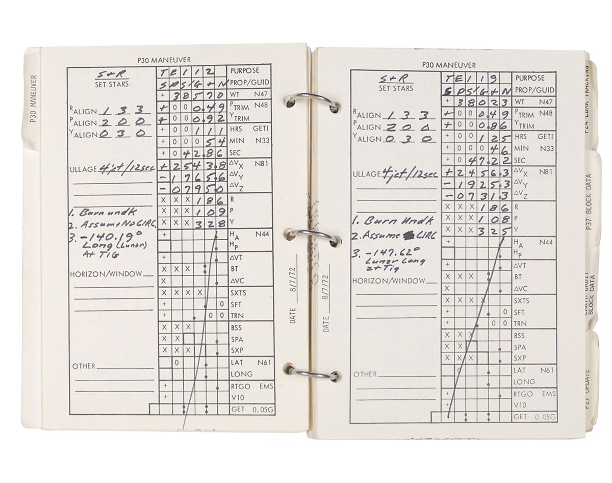 Throughout the duration of the mission, large lists of numbers, otherwise know as PADs (Pre-Advisory Data), were read by mission control up to the crew to provide them with the necessary information to accomplish a given maneuver. Houston had decided long ago that, in case of loss of communications, the astronauts should never be without the coordinates to return to Earth manually. P30’s importance was to predict the change (or anticipated change) in velocity associated with burning the Command Service Module's main engine. In this case, it appears the calculation is being entered to determine the duration of the Service Propulsion System (SPS) burn (which equates to a change in velocity or ‘Delta V’) that would be required to insert the spacecraft back on a return trajectory to Earth after Lunar Orbit Insertion. This historic checklist documents the last Trans Earth Insertion (TEI), the engine burn that brought the boys home for the last time. Single flown checklist pages are highly sought-after themselves, rendering an entirely complete astronaut certified checklist an extremely desirable rarity—especially from the Commander of the final Apollo mission. This is one of the last complete checklists of it’s kind in private hands.