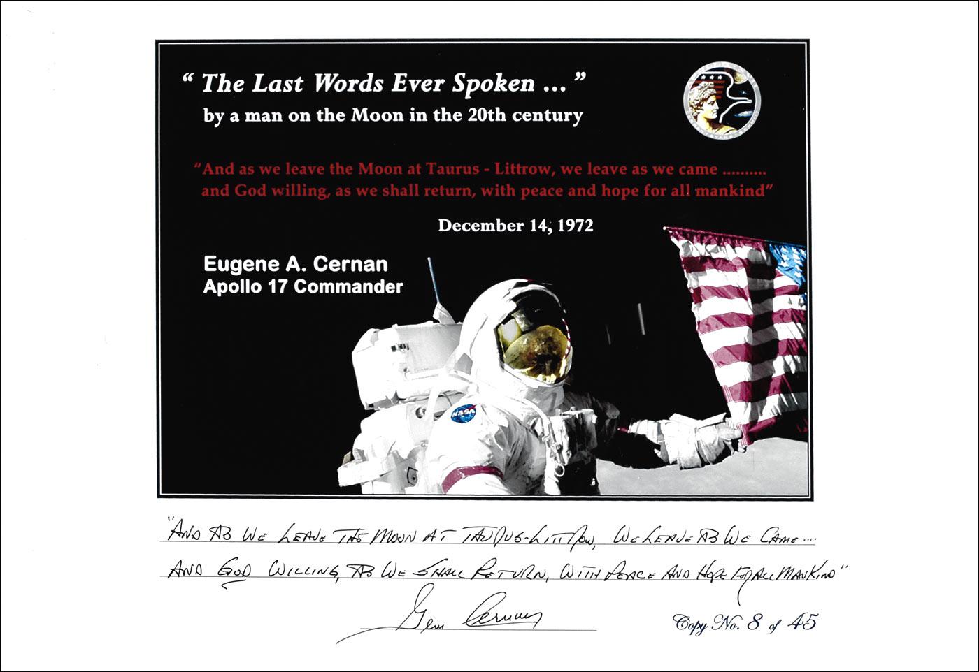 Color very limited edition 19 x 13 manuscript print entitled “The Last Words Ever Spoken,” numbered #8/45, bearing an image of Cernan on the lunar surface and a printed quotation of his last words spoken on the moon, signed in black felt tip underneath the image, with Cernan writing out the final words ever spoken by man on the moon: “And as we leave the Moon at ‘Taurus—Littrow,’ we leave as we came…and God willing, as we shall return, with peace and hope for all mankind,” and signed underneath, “Gene Cernan.” In very fine condition. In the years since leaving the moon, Cernan has rarely inscribed this quote in full, and as such few examples exist. This copy is one of only 45 examples that were created, and one of only 36 authorized for sale to collectors by Cernan. As such, it is one of the rarest space limited-editions ever created. RRAuction COA.