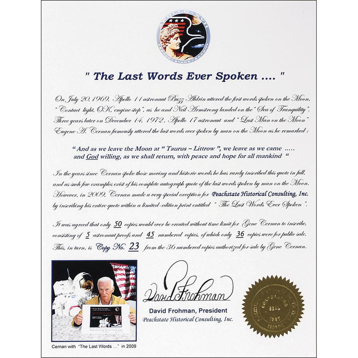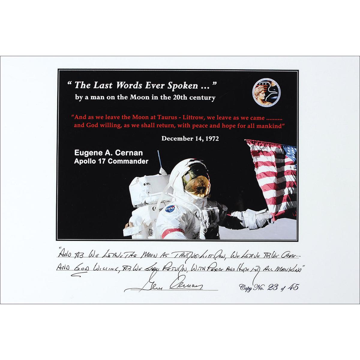 Color very limited edition 19 x 13 manuscript print entitled “The Last Words Ever Spoken,” numbered #23/45, bearing an image of Cernan on the lunar surface and a printed quotation of his last words spoken on the moon, signed in black felt tip underneath the image, with Cernan writing out the final words ever spoken by man on the moon: “And as we leave the Moon at ‘Taurus—Littrow,’ we leave as we came…and God willing, as we shall return, with peace and hope for all mankind,” and signed underneath, “Gene Cernan.” Rolled and in fine condition. In the years since leaving the moon, Cernan has rarely inscribed this quote in full, and as such few examples exist.