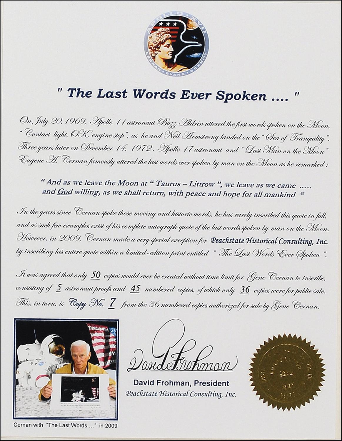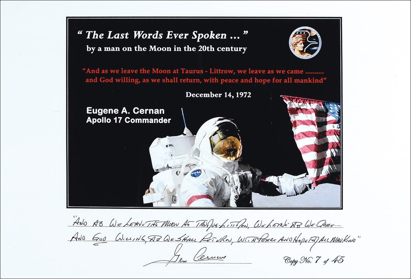 Color very limited edition 19 x 13 manuscript print entitled “The Last Words Ever Spoken,” numbered #7/45, bearing an image of Cernan on the lunar surface and a printed quotation of his last words spoken on the moon, signed in black felt tip underneath the image, with Cernan writing out the final words ever spoken by man on the moon: “And as we leave the Moon at ‘Taurus—Littrow,’ we leave as we came…and God willing, as we shall return, with peace and hope for all mankind,” and signed underneath, “Gene Cernan.” Rolled and in very fine condition. In the years since leaving the moon, Cernan has rarely inscribed this quote in full, and as such few examples exist. This copy is one of only 45 examples that were created, and one of only 36 authorized for sale to collectors by Cernan. As such, it is one of the rarest space limited-editions ever created.