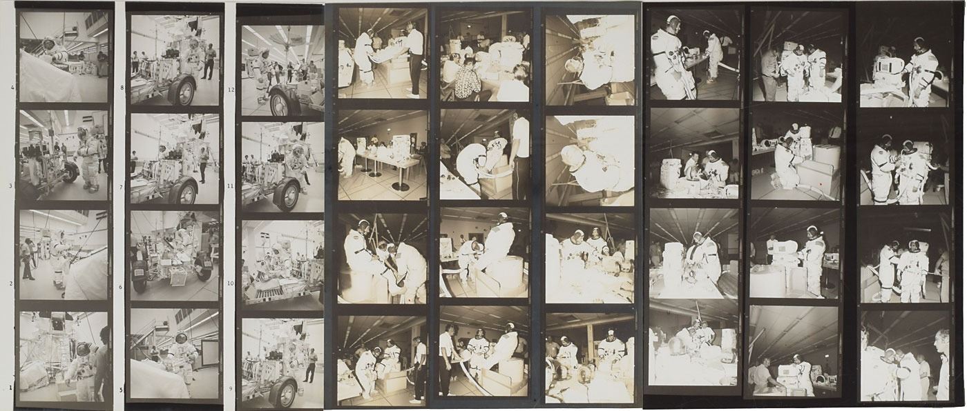 Set of three official semi-glossy 8 x 10 NASA contact sheets, each featuring 12 different images of the Apollo 17 lunar module crew at the Kennedy Space Center. Two contact sheets focus on CDR Gene Cernan and LMP Harrison Schmitt during fit and function testing of the Extravehicular Mobility Unit space suit; and the third contact sheet shows images of the LM crew entirely geared up for EVA tests with the lunar rover vehicle. Reverse of each contact sheet bears faded NASA caption text. In overall fine condition, with scattered light silvering.