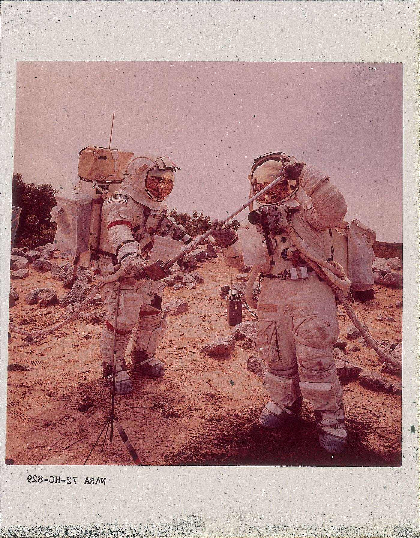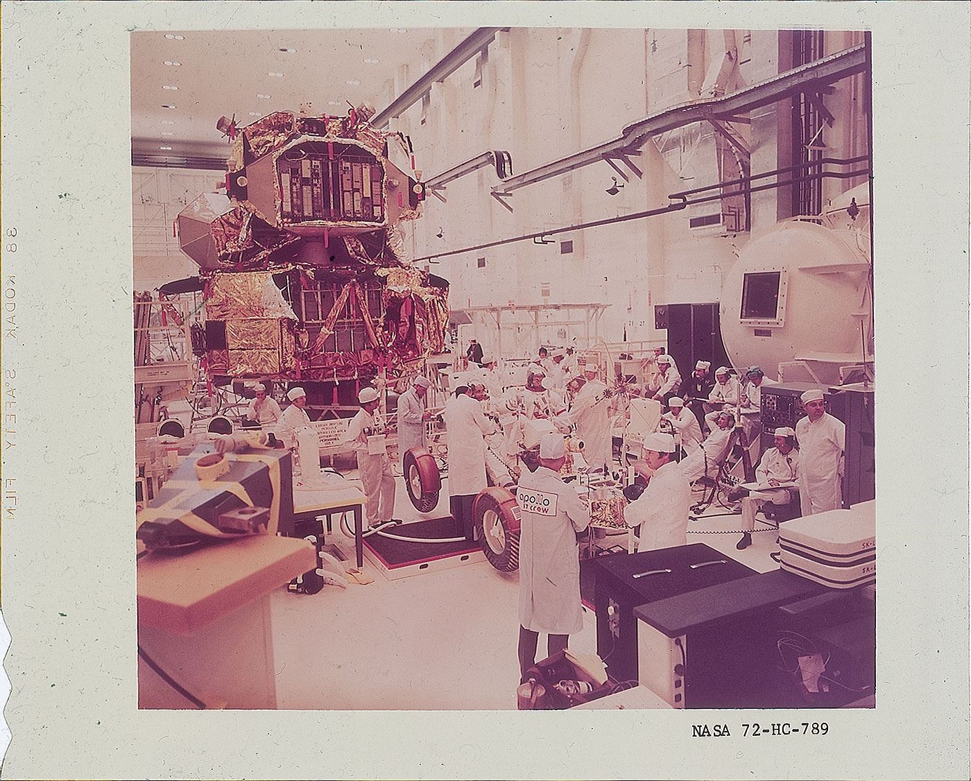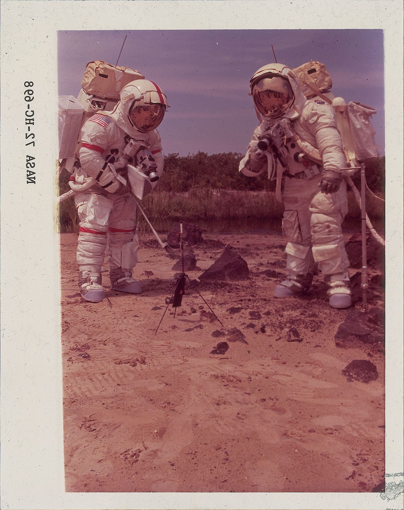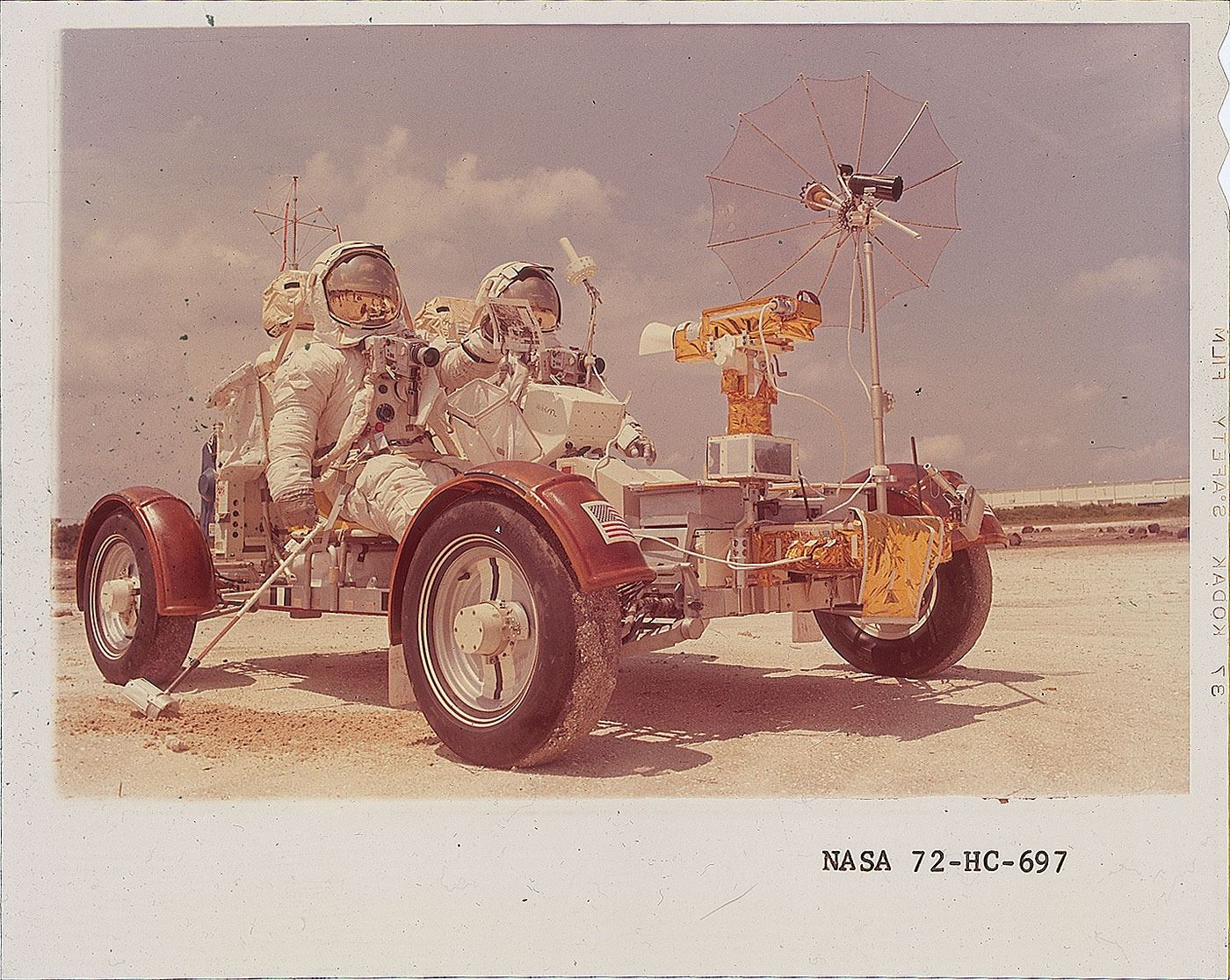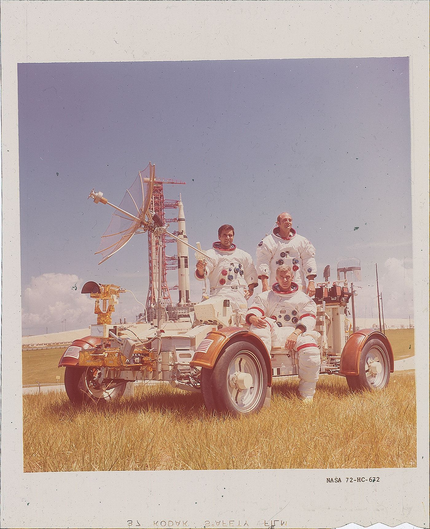 Five vintage official color NASA positive transparencies from the Apollo 17 mission, including: a 5 x 4 image of CDR Gene Cernan and LMP Harrison Schmitt training outdoors on the lunar rover, numbered "NASA 72–HC–697"; a 4 x 5 image of the Apollo 17 crew posing with the lunar rover and wearing their white space suits outdoors, numbered "NASA 72–HC–672"; two 4 x 5 images of Cernan and Schmitt during mockup lunar sample collecting exercises, numbered "NASA 72–HC–829" and "NASA 72–HC–698"; and a 5 x 4 image of a very busy Flight Crew Training Building, which shows Cernan and Schmitt sitting in the lunar rover and surrounded by NASA personnel, with the lunar module pictured in the background, numbered: "NASA 72–HC–789." In overall fine condition.