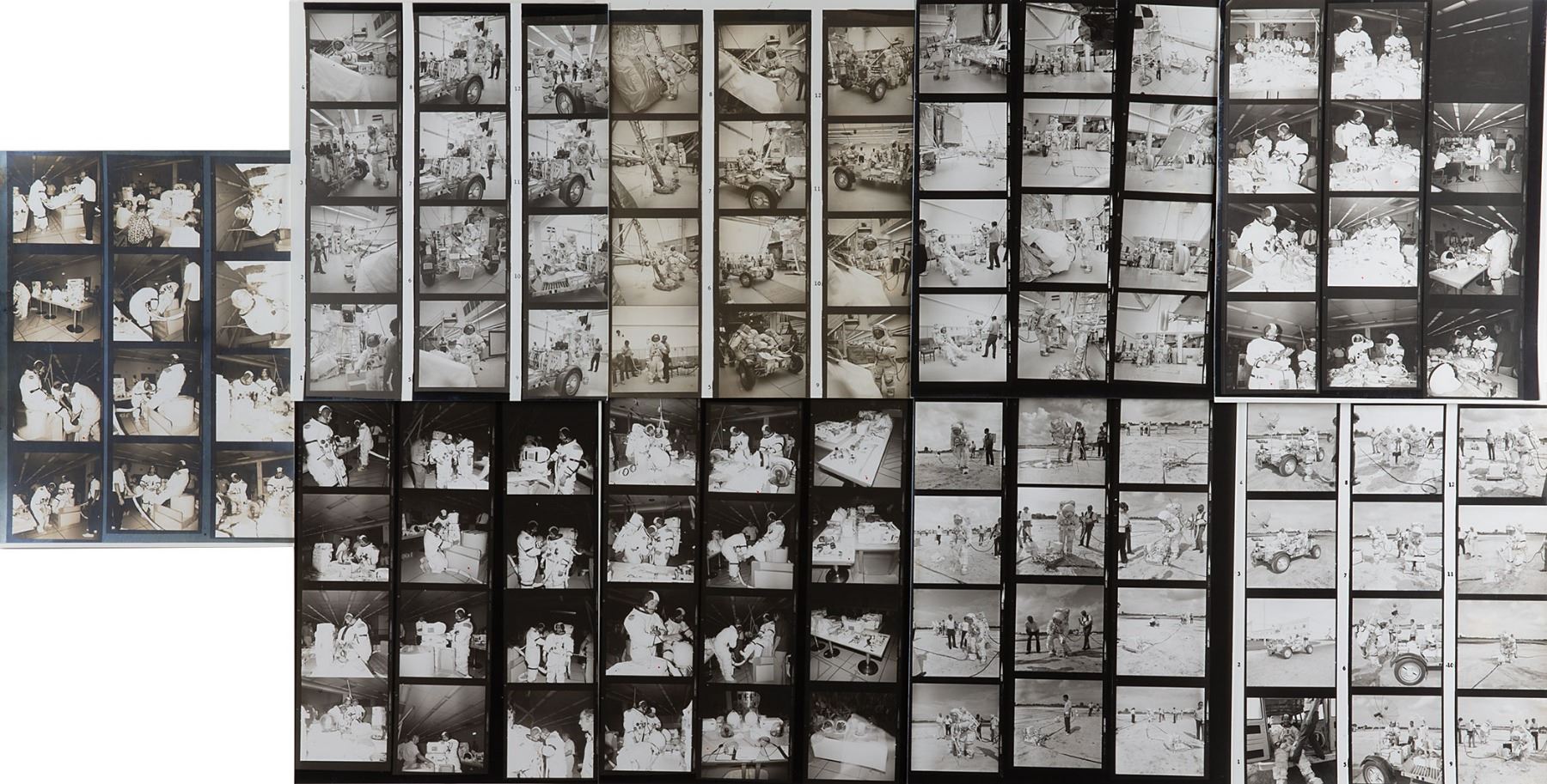 Group of nine official semi-glossy 8 x 10 NASA contact sheets, each featuring 12 different images, with one sheet focusing of the Apollo 17 lunar module crew and two of the Apollo 17 lunar module backup crew during training at the Kennedy Space Center. Two prime crew contact sheets focus on CDR Gene Cernan and LMP Harrison Schmitt during fit and function testing of the Extravehicular Mobility Unit space suit, and the third sheet shows images of the LM crew entirely geared up for EVA tests with the lunar rover vehicle. The backup contact sheets show CDR John Young and LMP Charlie Duke during fit and function testing of the Extravehicular Mobility Unit space suit as well as them geared up for outside EVA testing. Reverse of each contact sheet bears faded NASA caption text. In overall fine condition, with scattered light silvering.
