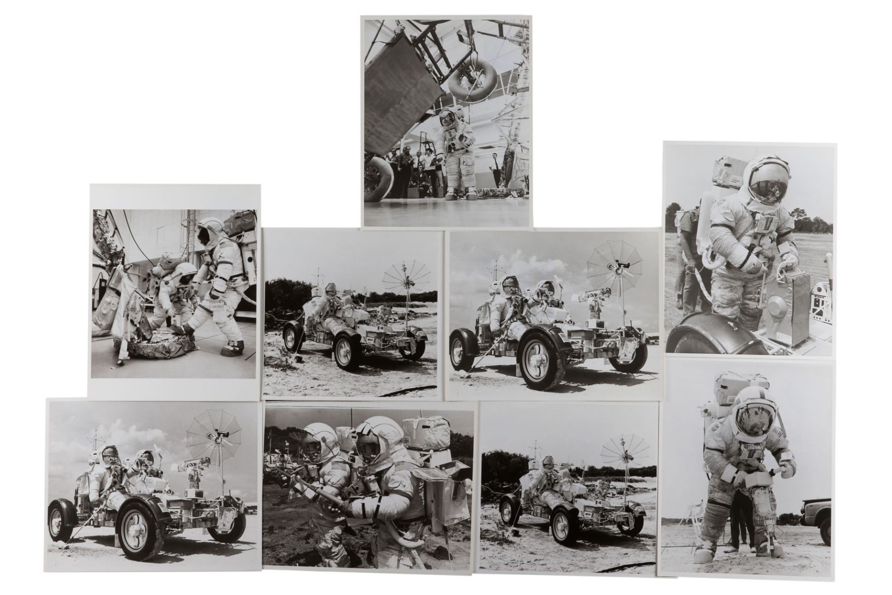 Set of nine original vintage glossy NASA photos, 8 x 10 and 10 x 8, depicting the two-man lunar module crew of Apollo 17 during training at the Kennedy Space Center, with images including: a fantastic full-length image of CDR Gene Cernan using a lunar drill during EVA training; Cernan wearing his EMU and preparing to remove a traverse gravimeter mockup from the lunar rover; LMP Harrison Schmitt brushing Cernan’s boot prior to entering the lunar module mockup; Schmitt watching the lunar rover being deployed from the lunar module trainer; Cernan and Schmitt practicing taking lunar soil and rock samples; two identical images of Schmitt seated in the rover and deploying an explosive charge during an EVA-1 training session (backup John Young next to him); and two identical images of Cernan and Schmitt seated in the rover during EVA training. Reverse of each photo features purple NASA caption text. In overall fine condition, with a few light corner creases.