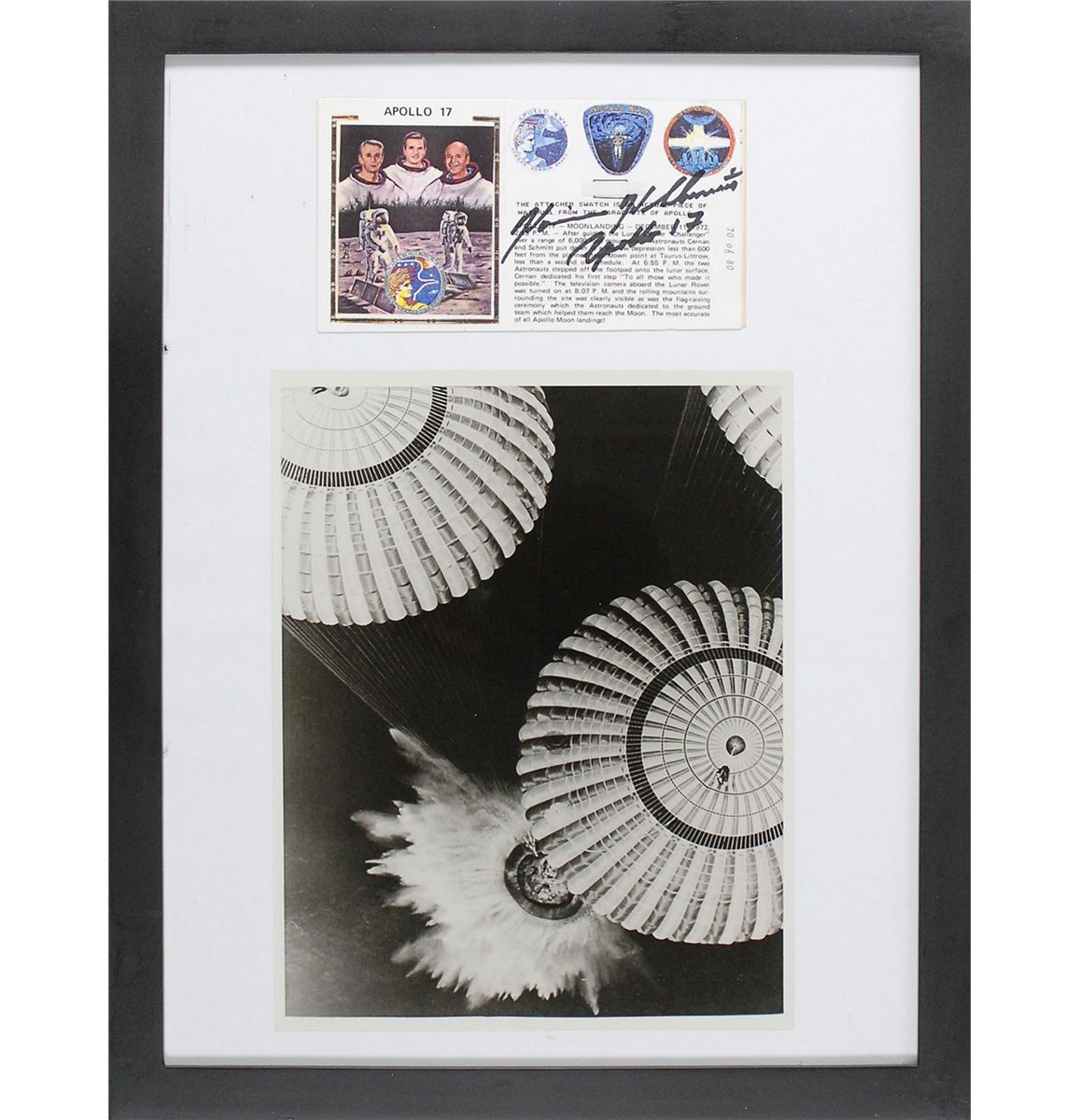 A limited edition display consisting of an almost one-inch long swatch of flown parachute material, taken from the main chute of the Apollo 17 capsule, affixed to a descriptive card modeled after a commemorative cover, numbered 70/80, signed in black felt tip, “Harrison H. Schmitt, Apollo 17.” Framed with an original vintage glossy 8 x 10 NASA photo of the splashdown to an overall size of 13.25 x 17.25. In fine condition.