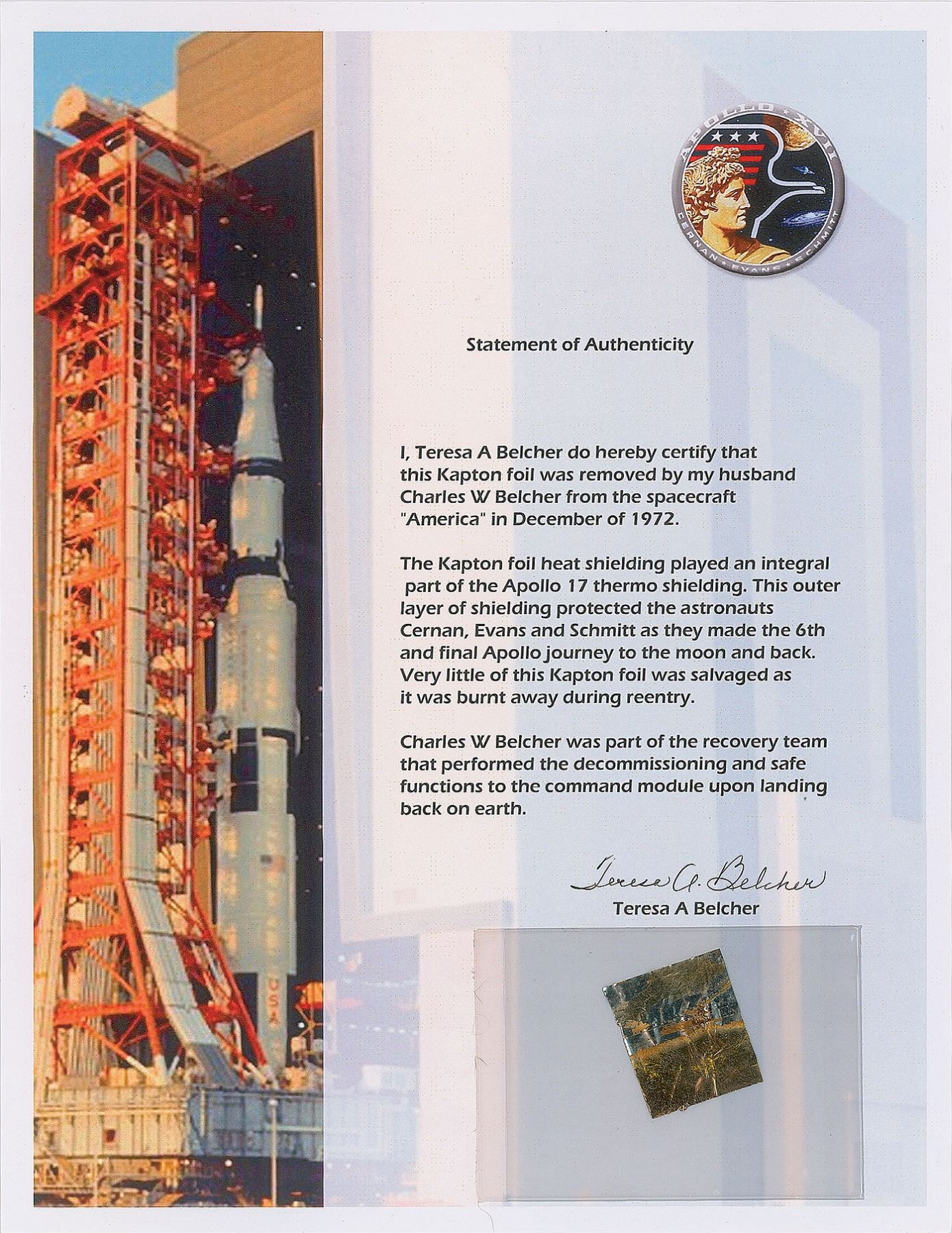 Flown 1 x 1.25 swatch of Kapton foil from the heat shield of the Apollo 17 command module America, housed in a clear plastic pouch affixed to a 8.5 x 11 statement of authenticity, reading, in part: “I, Teresa A Belcher do hereby certify that this Kapton foil was removed by my husband Charles W Belcher from the spacecraft 'America' in December of 1972…Charles W Belcher was part of the recovery team that performed the decommissioning and safe functions to the command module upon landing back on earth." In fine condition.