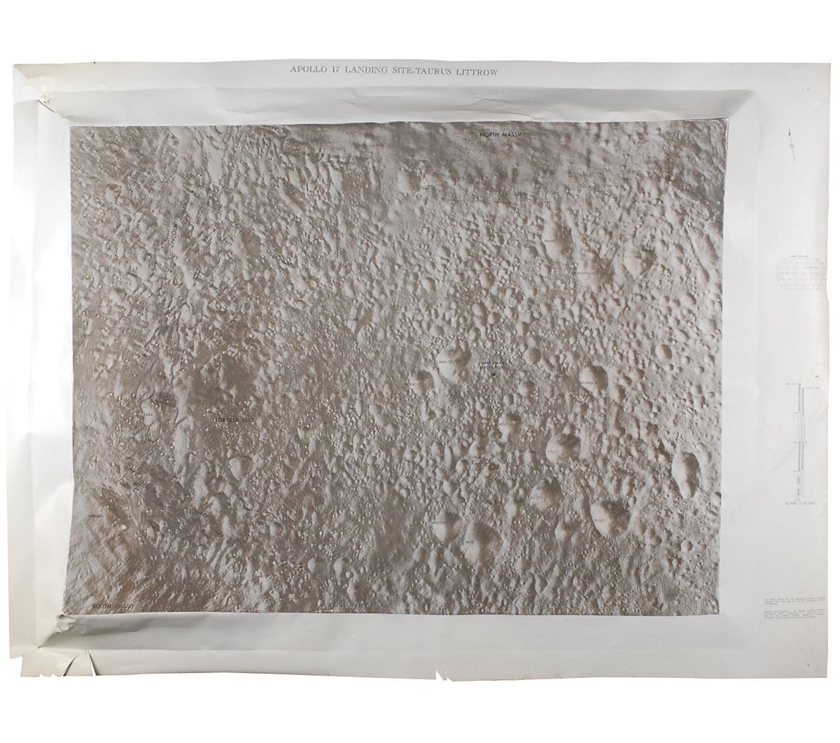 Scarce Apollo 17 landing site lunar 3-D topographical map. This massive plastic map measures 44 x 33 and is an exact 1:12,500 scale reproduction of the landing site at Taurus-Littrow. The landing site is identified on the map as “Approximate target point,” with other lunar landmarks including Horatio, Camelot, and Shakespeare. Produced by the US Army Typographical Command at the request of the Department of Defense, this map was used to familiarize the Apollo moonwalkers with what they would see when they approached the landing site. The map also gave them a view of the surrounding terrain since they would have mainly tunnel vision during landing. In very good condition, with several cracks and chips to edges.