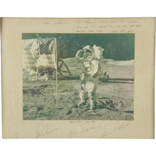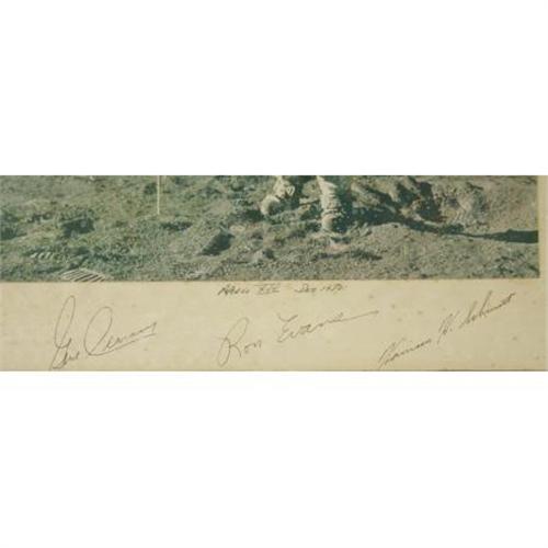 <B>Apollo 17 Large Signed Color Photograph,</B></I> 13.75" x 10.75", matted to 19.5" x 15.5". Inscribed on the mat "<I>To Joe Garino - You Traveled Every Mile We Covered/ Joe and We Thank You For All The Help/ Along The Way - Gene Ron Jack/ Apollo XVII Dec 1972/ Gene Cernan,</B></I>" also signed "<I>Ron Evans</B></I>" and "<I>Harrison H. Schmitt.</B></I>" Photo is slightly faded and the mat is lightly foxed. Framed to 21.5" X 17.5". <I>From the collection of renowned former physical trainer of the astronauts Joe Garino. This lot is accompanied by a signed certificate of authentication from Garino verifying its provenance.</B></I><BR><BR><b>Shipping:</b> Framed - with Glass, Medium (<a target="_blank" href="http://www.heritageauctions.com/common/shipping.php">view shipping information</a>)