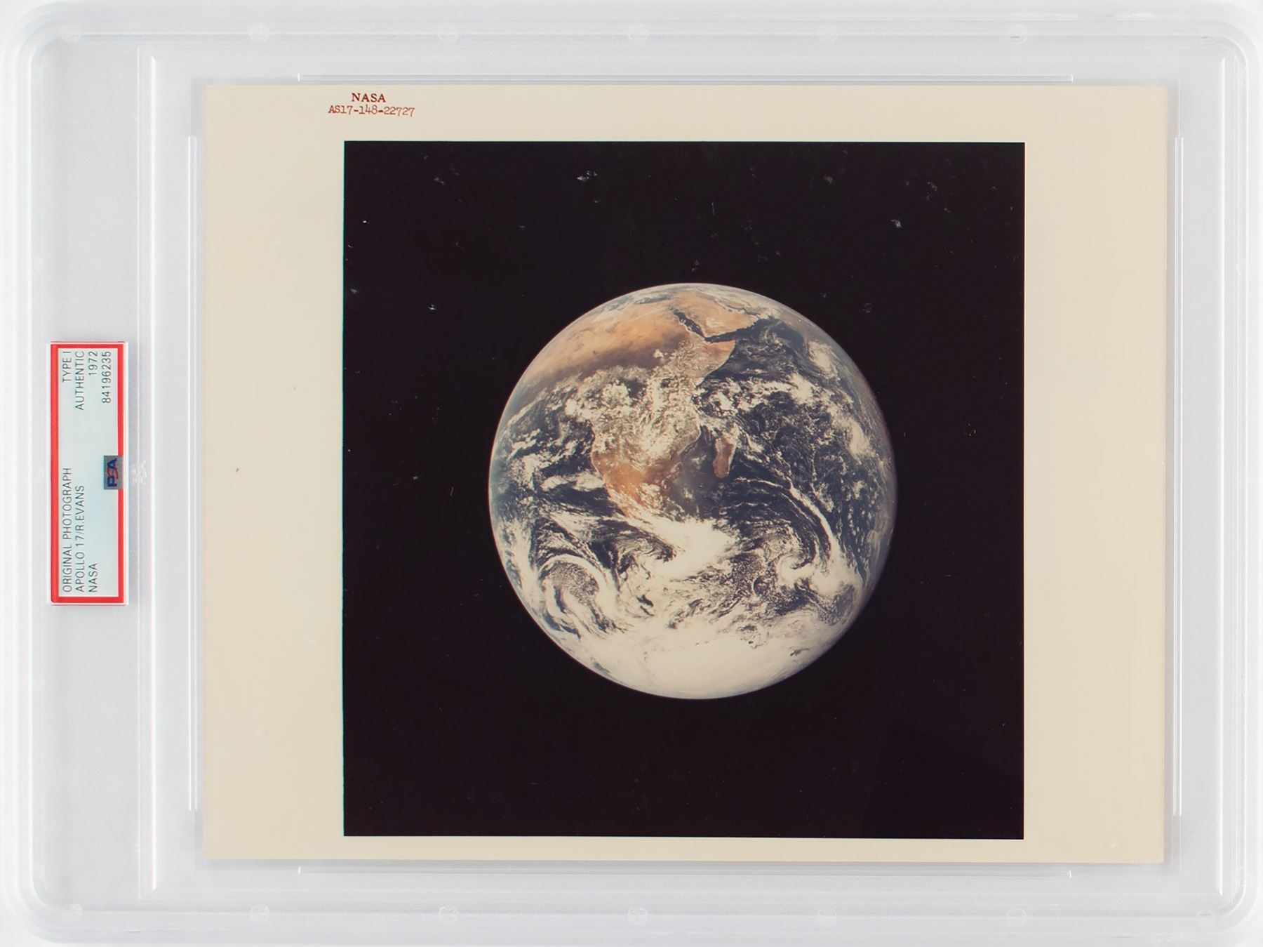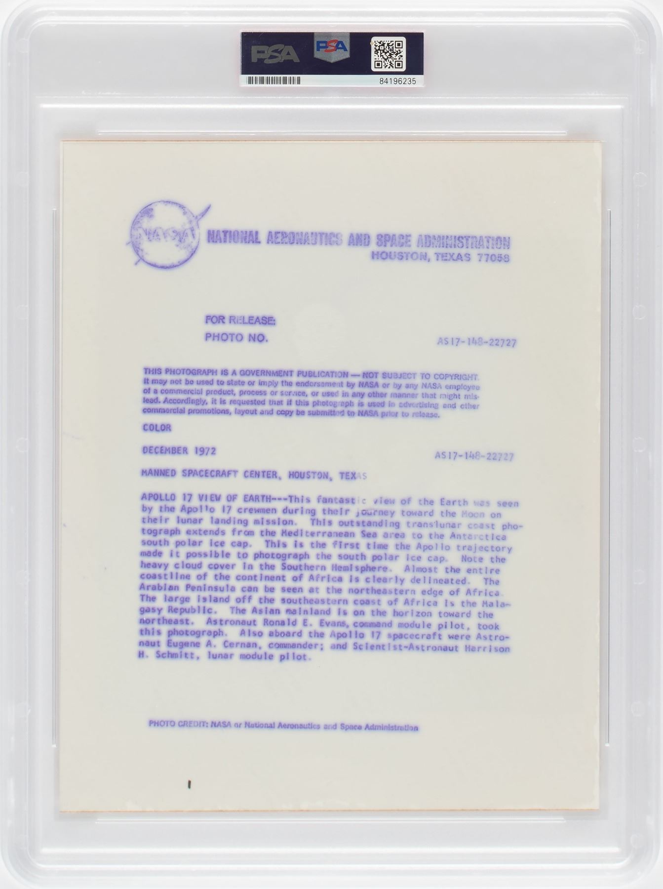 Official color glossy 10 x 8 red-numbered NASA photo (AS17-148-22727), which shows a magnificent view of Earth as seen by the Apollo 17 crew during their trans-lunar coast to the moon. Reverse bears "A Kodak Paper" watermarks and purple NASA caption text. In fine condition. Encapsulated by PSA as an authentic 'Type I' photograph.