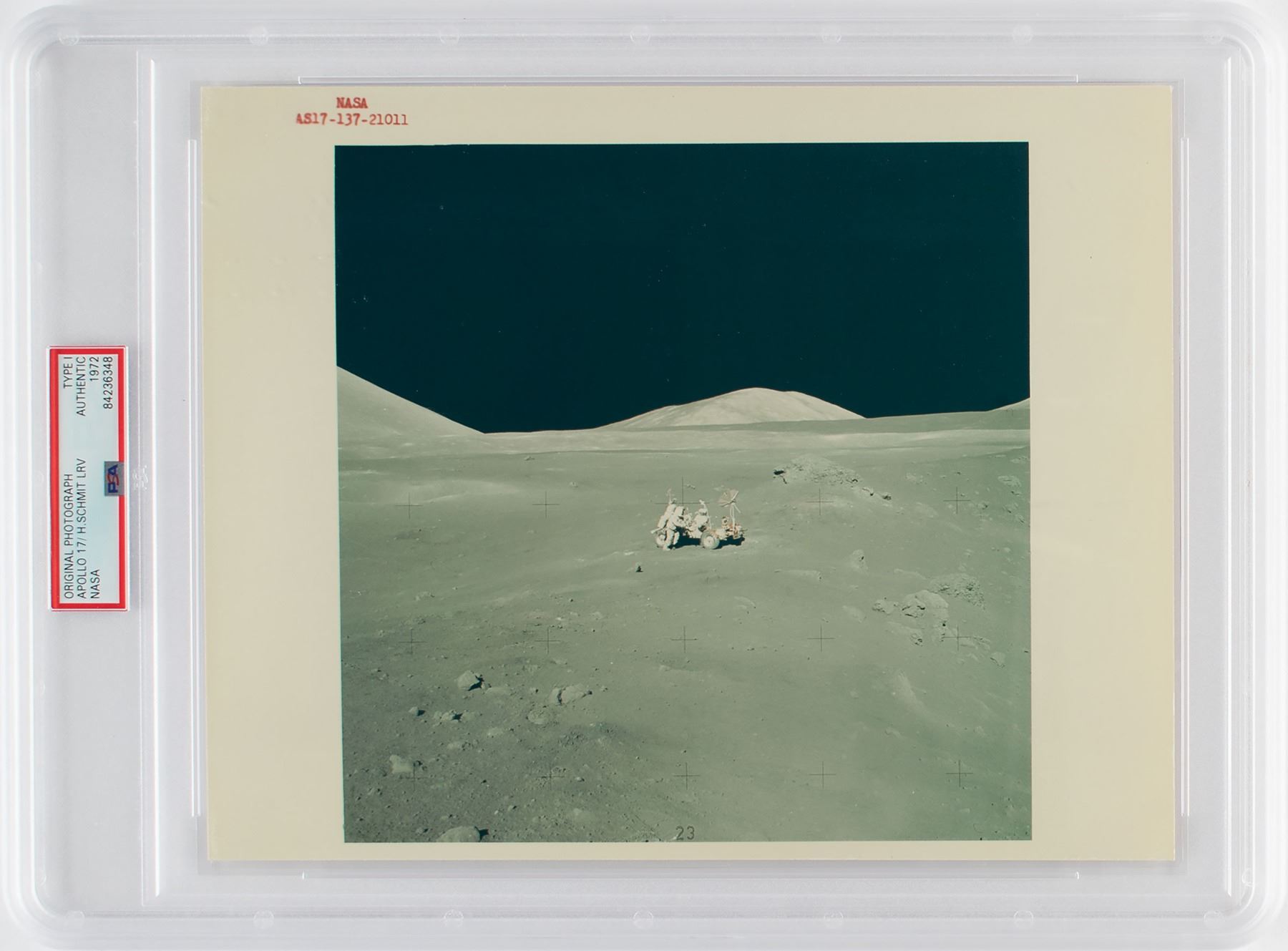 Official color glossy 10 x 8 red-numbered NASA photo (AS17-137-21011), which shows LMP Harrison Schmitt working at the LRV during the second Apollo 17 EVA. Reverse bears "A Kodak Paper" watermarks and purple NASA caption text. In fine condition. Encapsulated by PSA as an authentic 'Type I' photograph. From The Gene Kranz Collection. Kranz served as a flight director for Apollo 17.