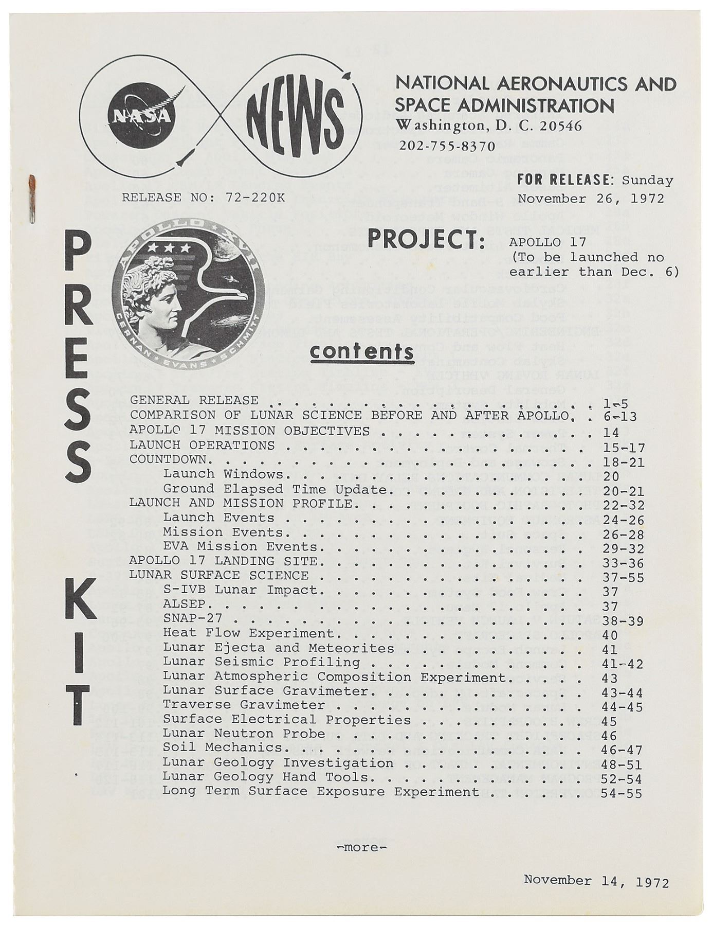 Staple-bound press kit for the Apollo 17 mission, 121 pages, 8 x 10.5, November 14, 1972. Issued by NASA News as release no. 72–220K, this extremely informative press kit covers seemingly all aspects of the final Apollo mission, including: Comparison of Lunar Science Before and After Apollo, Apollo 17 Mission Objectives, Launch Operations, Countdown, Launch and Mission Profile, Apollo 17 Landing Site, Lunar Surface Science, Lunar Orbital Science, Medical tests and Experiments, Engineering/Operational tests and Demonstrations, and Lunar Roving Vehicle. The kit also features a wealth of detailed tables and illustrations. In fine condition.