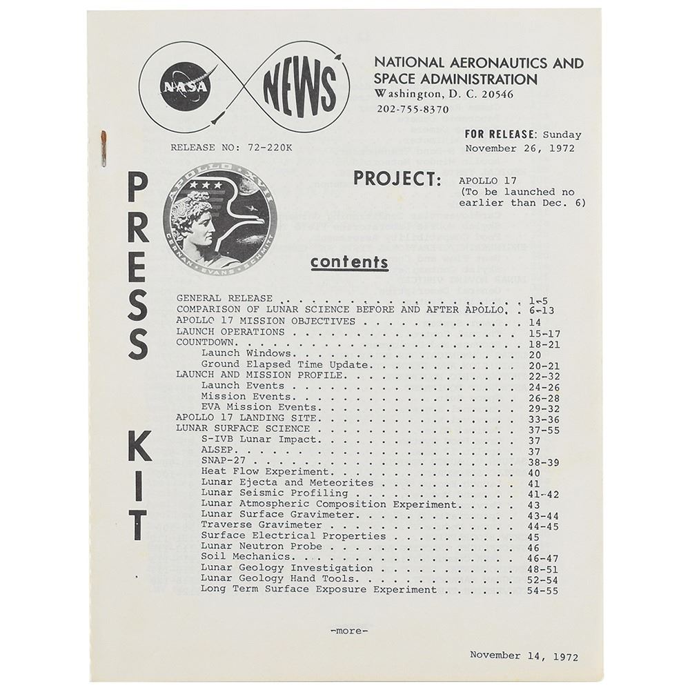 Staple-bound press kit for the Apollo 17 mission, 121 pages, 8 x 10.5, November 14, 1972. Issued by NASA News as release no. 72–220K, this extremely informative press kit covers seemingly all aspects of the final Apollo mission, including: Comparison of Lunar Science Before and After Apollo, Apollo 17 Mission Objectives, Launch Operations, Countdown, Launch and Mission Profile, Apollo 17 Landing Site, Lunar Surface Science, Lunar Orbital Science, Medical tests and Experiments, Engineering/Operational tests and Demonstrations, and Lunar Roving Vehicle. The kit also features a wealth of detailed tables and illustrations. In fine condition.