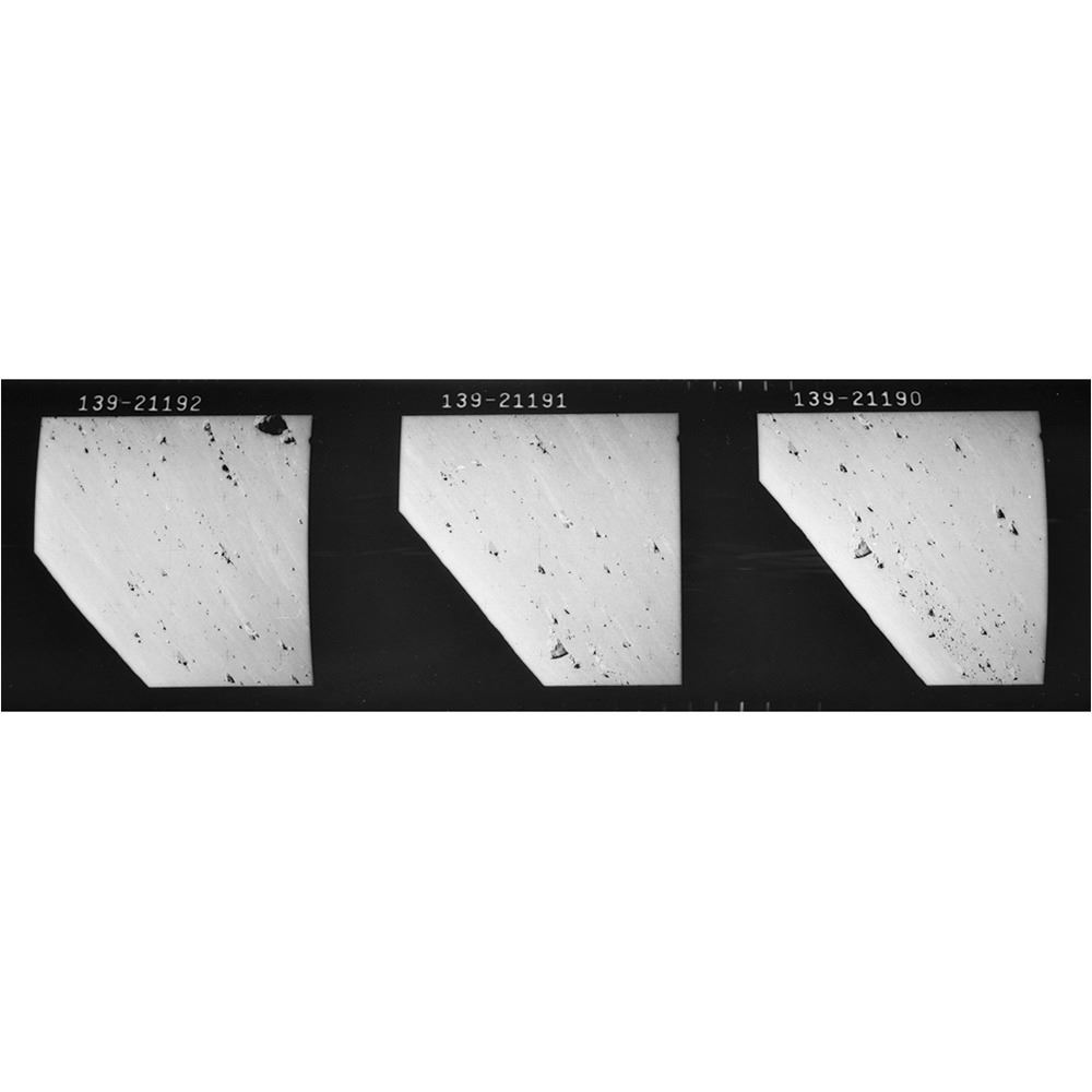 Roll of third-generation 70mm black-and-white positive transparencies of lunar surface photographs captured by the Hasselblad camera during Apollo 17, comprising Magazines K and LL for a total of over 300 images. These include images of the moon's surface at the North Massif site in the Taurus-Littrow valley, captured during man's final moonwalk on Apollo 17's EVA-3 (including a few with the Lunar Module far off in the distance), as well as lunar features captured while in orbit such as the landing sites of Apollo 15, 16, and 17, the Mare Tranquillitatis, and the craters 'Copernicus,' 'Euler,' 'Tsiolkovskiy,' 'Nassau,' 'Aitken,' 'Proclus,' and others. In fine condition, with expected wear.