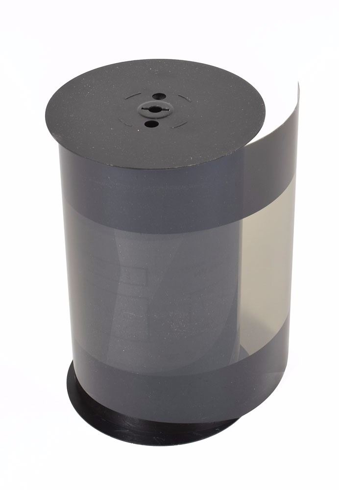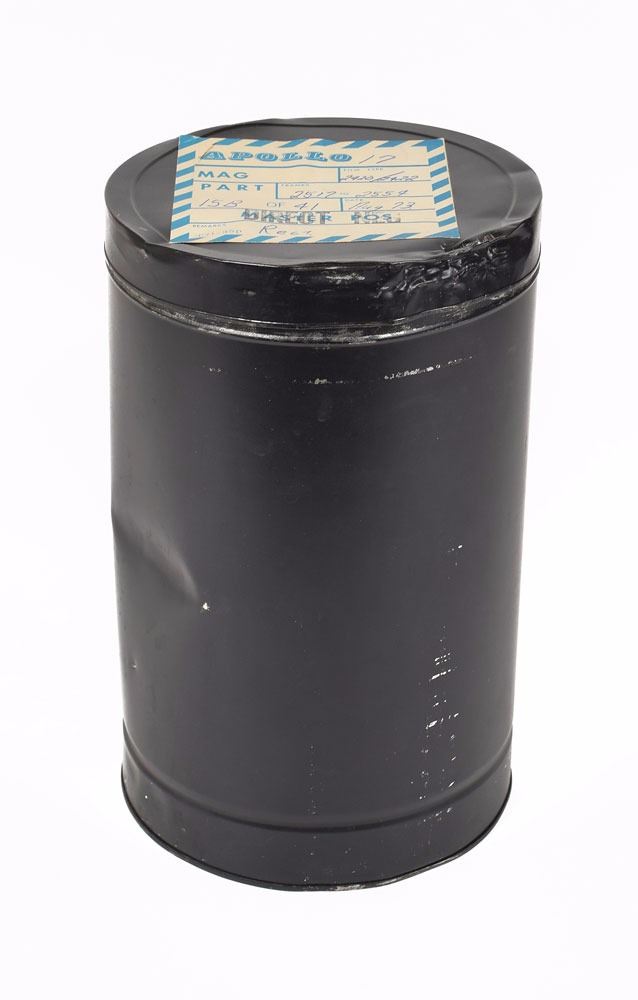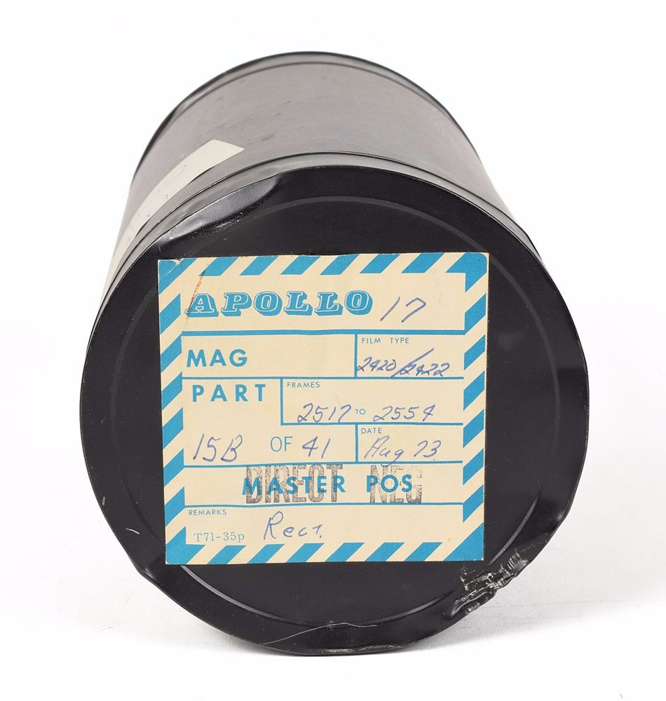 Roll of direct negatives of the lunar landscape taken by the panoramic camera in the Scientific Instrument Module (SIM) Bay of the Apollo 17 CSM, in its original canister measuring 10? tall and 6.25? in diameter. The label on the top reads: “Apollo 17, Mag, Film type: 2420/2422, Part 15B of 41, Frames 2517 to 2554, Date Aug 73, Master Pos Direct Neg Rect.” In very good to fine condition, with various dents to canister and lid, heaviest to the latter. This film was directly reproduced from the original negatives taken in space by the 24-inch-focal-length Itek camera carried in the CSM SIM Bay, which were retrieved by Ron Evans during an EVA prior to reentry. These high-resolution lunar panoramas were used in improving NASA’s lunar maps.