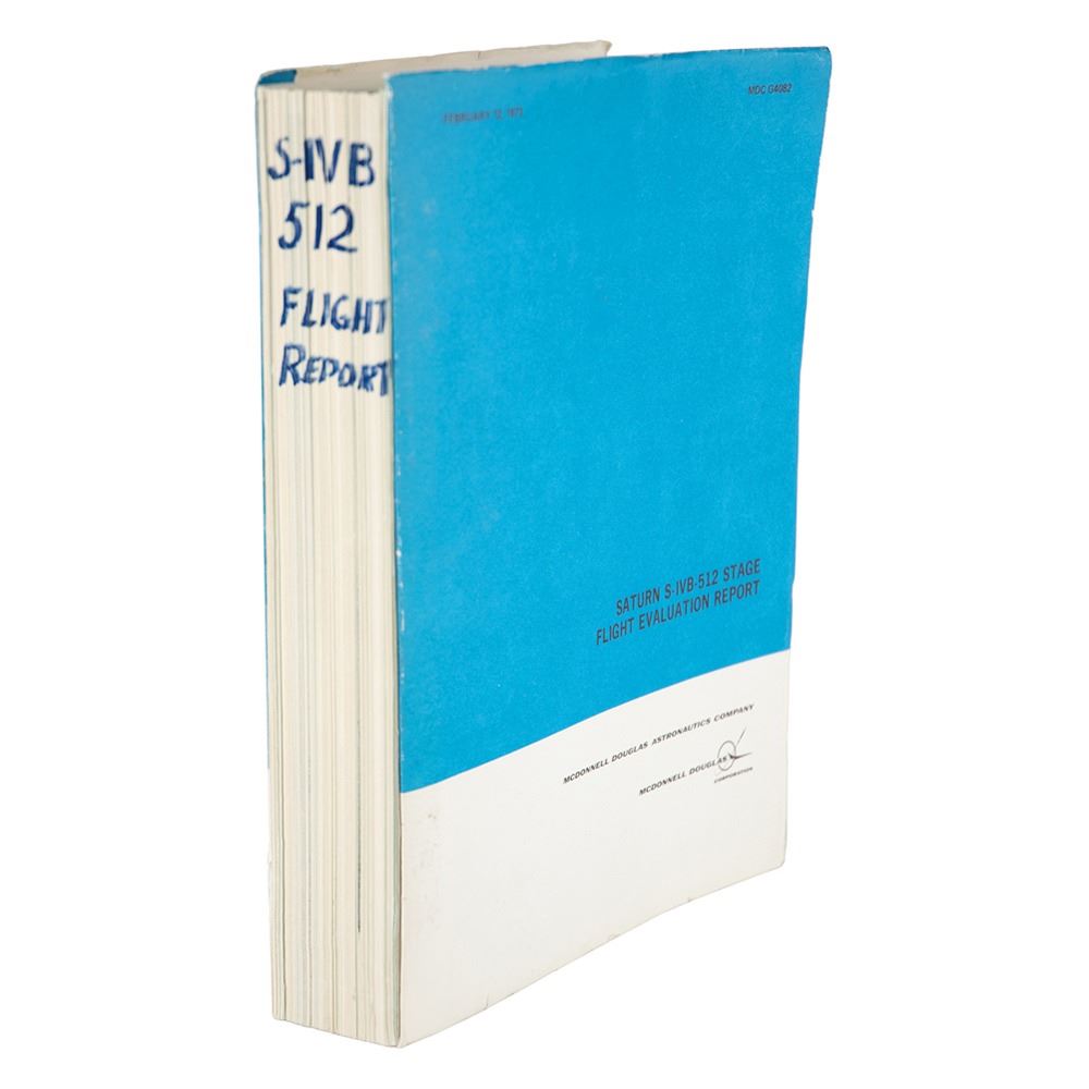 Softcover report entitled "Saturn S-IVB-512 Stage Flight Evaluation Report" prepared after the Apollo 17 flight by McDonnell Douglas, 8.5 x 11, February 12, 1973. The introduction notes: "This report presents the results of analyses performed of the S-IVB-512 Stage operation during the AS-512/Apollo 17 Mission." The report is split into 19 sections with tabbed dividers for the various systems and subsystems of the spacecraft. In fine condition.