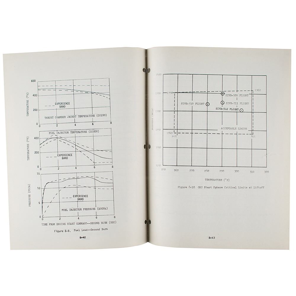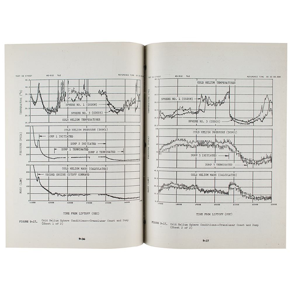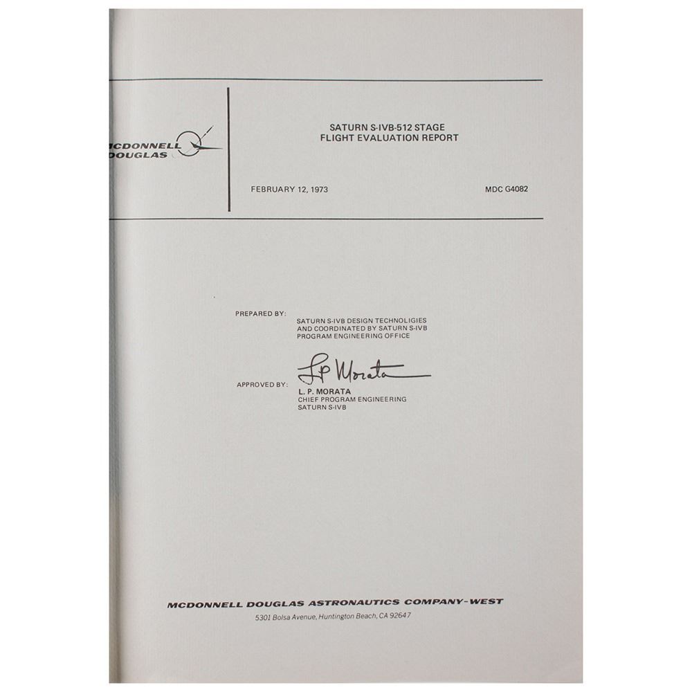 Softcover report entitled "Saturn S-IVB-512 Stage Flight Evaluation Report" prepared after the Apollo 17 flight by McDonnell Douglas, 8.5 x 11, February 12, 1973. The introduction notes: "This report presents the results of analyses performed of the S-IVB-512 Stage operation during the AS-512/Apollo 17 Mission." The report is split into 19 sections with tabbed dividers for the various systems and subsystems of the spacecraft. In fine condition.