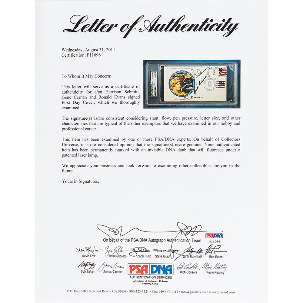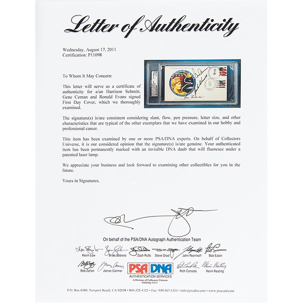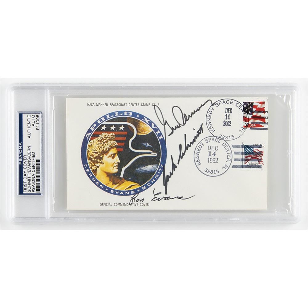 Apollo 17 anniversary cover with a cachet of the mission insignia and text to top and bottom, "NASA Manned Spacecraft Center Stamp Club, Official Commemorative Cover," 6.5 x 3.5, signed in black felt tip by the entire crew: "Gene Cernan," "Jack Schmitt," and "Ron Evans." The cover features postmarks dated December 14th in the years 1992 and 2002, and the reverse flap is numbered in pencil, “103.†In fine condition. Encapsulated in a PSA/DNA authentication holder. Accompanied by a full letter of authenticity from PSA/DNA.