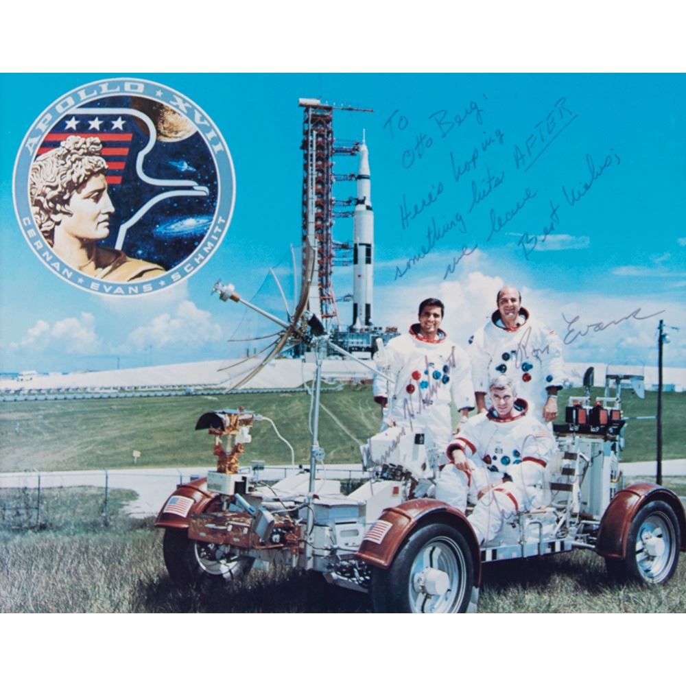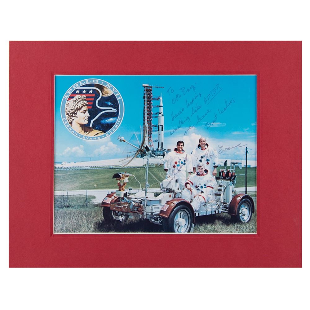 Official color 9.5 x 7.5 NASA lithograph photo of the Apollo 17 crew posing on an LRV at Cape Canaveral, playfully inscribed in another hand in black felt tip, "To Otto Berg: Here's hoping something hits AFTER we leave. Best wishes,” and signed by the crew, "Gene Cernan," "Harrison H. Schmitt," and "Ron Evans." Matted to an overall size of 13.75 x 10.75. In very good to fine condition, with signatures uniformly faded. A desirable crew-signed portrait presented to NASA's top cosmic dust researcher, boasting a humorous inscription related to his studies.