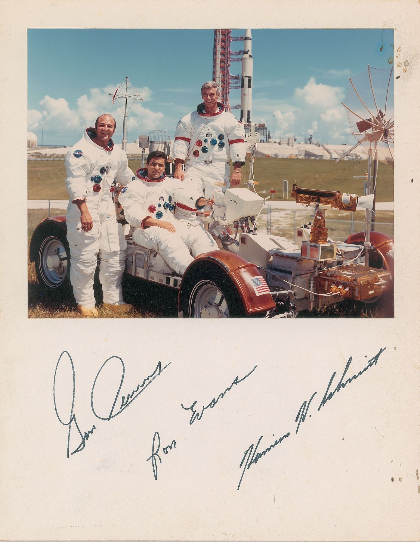 Official color semi-glossy 9.5 x 7.5 NASA photo of the Apollo 17 crew posing in their white space suits with the lunar rover and the Saturn V launch vehicle looming in the background, affixed to an 11 x 14 mount, signed on the mount in black felt tip, "Gene Cernan," "Ron Evans," and "Harrison H. Schmitt." In very good to fine condition, with some spots of soiling along right edge.
