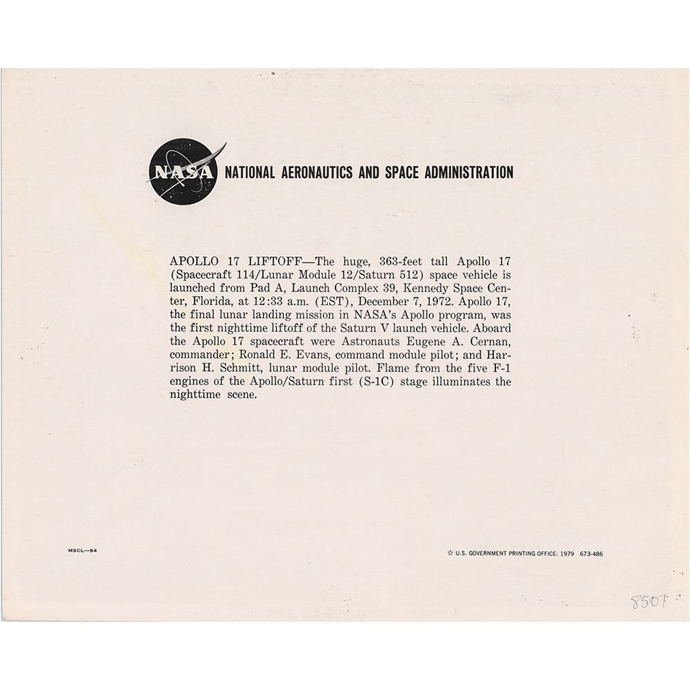 Official color 10 x 8 NASA lithograph of the stunning nighttime launch of the Apollo 17 mission, signed and inscribed in black ink, "To Ron Hoffman, Best wishes, Ron Evans, Apollo 17, 4 May 85," in black felt tip, "To Ron—My best to you, Gene Cernan," and "Harrison Schmitt.†In very good to fine condition, with scattered light creasing.