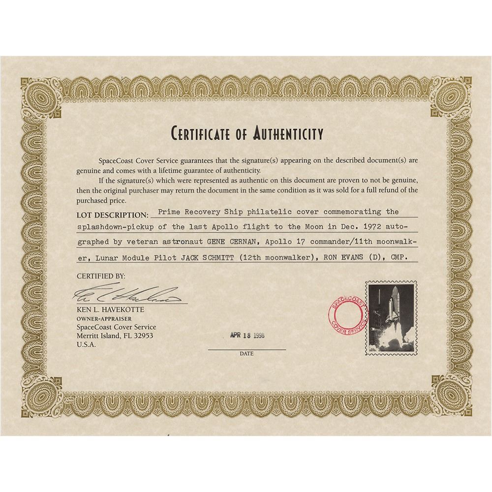 Attractive ‰Û÷splashdown‰Ûª cover with a color cachet honoring the U.S. Navy Pacific Recovery Force that retrieved the crew of the Apollo 17 mission, postmarked onboard the recovery ship the USS Ticonderoga on December 19, 1972, signed in black ballpoint by Gene Cernan and Ron Evans, and in black felt tip by Harrison Schmitt. In fine condition, with a light rectangular stain in the address area. Accompanied by a certificate of authenticity from Ken Havekotte.