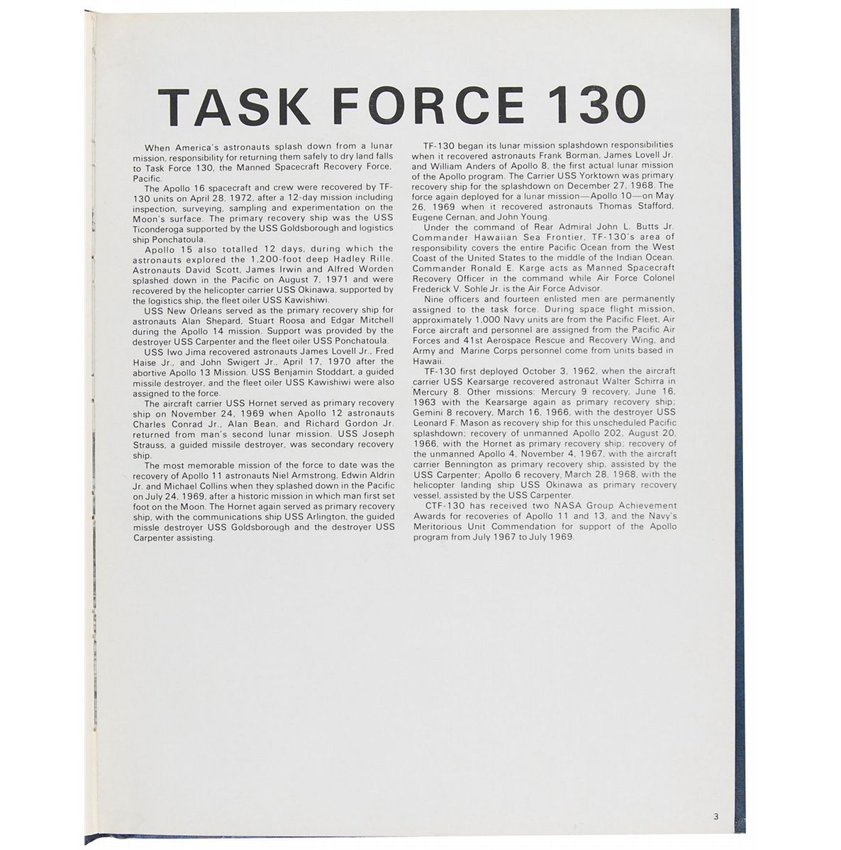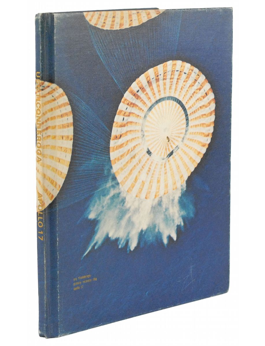 Unsigned book: USS Ticonderoga Apollo 17. First edition. USS Ticonderoga/Pischel Yearbooks, 1972. Hardcover, 8.75 x 11.25, 112 pages. In very good condition, with dampstaining and rippling to upper portions of pages, and scattered light wear and rubbing to covers.