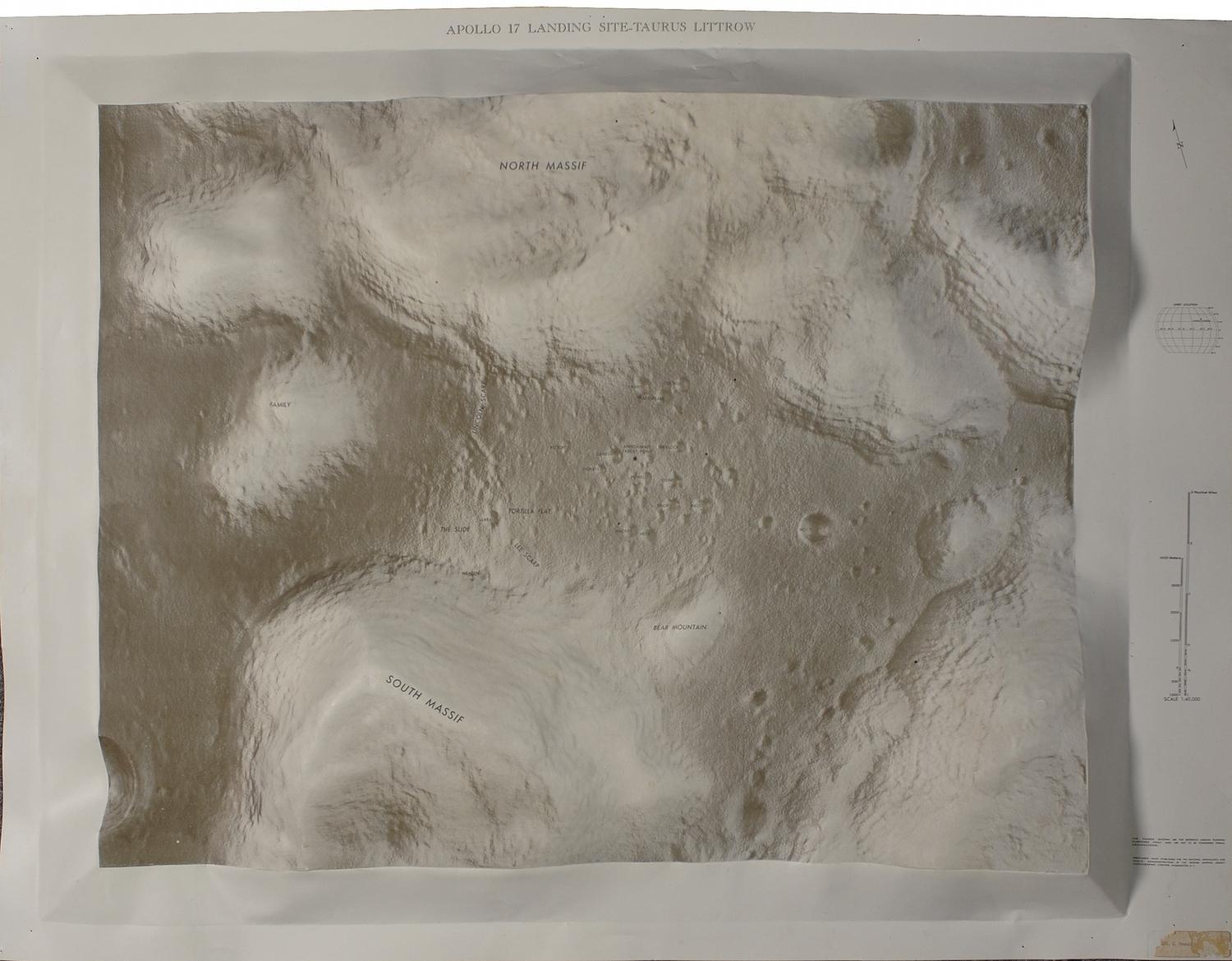 A rare Apollo 17 topographic plastic model taken from the LM simulator surface model used to train the astronauts. Map measures 44 x 34, and is of their actual landing site, Taurus-Littrow. This 1:40,000 map shows the target site near the center, with the impressive North and South Massifs dominating the top and bottom of the map. Other lunar landmarks labeled include Tortilla Flat, Lincoln Scarp, Bear Mountain, and The Slide. Legend on the right edge gives the longitude and latitude of the landing site, and states the map is “prepared and published for the National Aeronautics and Space Administration by the Defense Mapping Agency Topographic Center.” Accompanied by a letter of authenticity from NASA Crew Station Subsystem Manager for the Lunar Module George Franklin providing background information on the use of the simulator, and attesting this model was taken from the simulator surface model. In part: “This model was molded from the simulator lunar surface model. The simulator lunar surface model was approximately 20 feet by 40 feet…an optical probe was attached to a scaled LM along a thrust axis…Each flight, beginning with Apollo 10, had its own particular lunar surface model…The simulator was programmed to fly the auto flight trajectory, beginning with the powered descent initiation…The crew monitored the visual display during this final phase and when the time for landing approached, then took over and flew to a crew selected landing.” He closes the letter by stating “This author was the Crew Station Subsystem Manager for the Lunar Module from 1963 through the end of the Apollo program. I was responsible for all the crew interfaces in the cabin as well as providing integration engineering for the flight crews. My activities included working with the procedures personnel, simulator interfaces, other system engineers, mission planning, mockup development and other crew training activities.” Map shows scattered dings and bends, primarily to edges, as well as tack holes to corners. Only a few known copies of lunar landing site topographical maps are known to exist, with just a scant handful available for public sale.