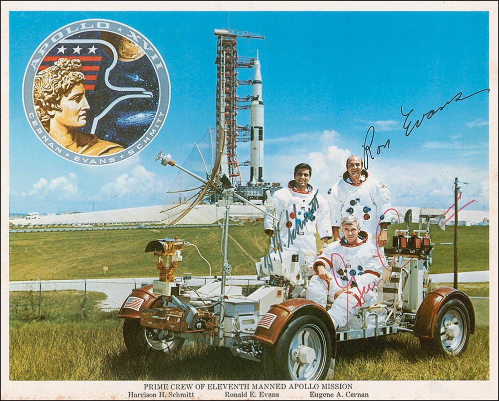 Color 10 x 8 NASA photo of the Apollo 17 crew in their spacesuits sitting in their lunar rover while still on Earth, signed in black felt tip “H. H. Schmitt” and “Ron Evans,” and in red felt tip “Gene Cernan.” A few light creases and toning and staining along the edges, a bit heavier at the bottom, otherwise fine condition. Difficult to obtain an uninscribed example such as this.
