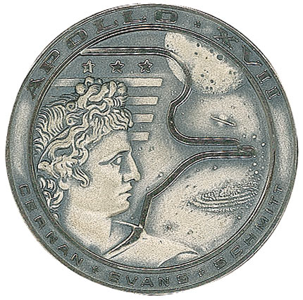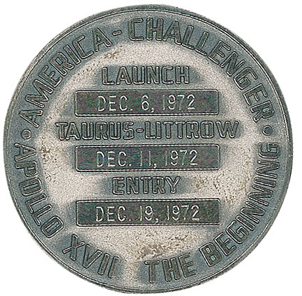 Unflown Apollo 17 Robbins Medal, approximately 1.5 diameter, with a raised design on the face of the Apollo 17 mission insignia. The reverse of the sterling silver medal is engraved “America-Challenger Apollo XVII—The Beginning” along with the December 6, 1972, launch date, December 11, 1972, moon landing date, and December 19, 1972, return date. This medal is serial numbered “124”—meaning it was not flown in space. Only serial numbers F1 to F80 were flown of 300 total medallions struck. Normal condition. This item originated from the collection of Buzz Aldrin and was first sold in 1990 by Superior Galleries.