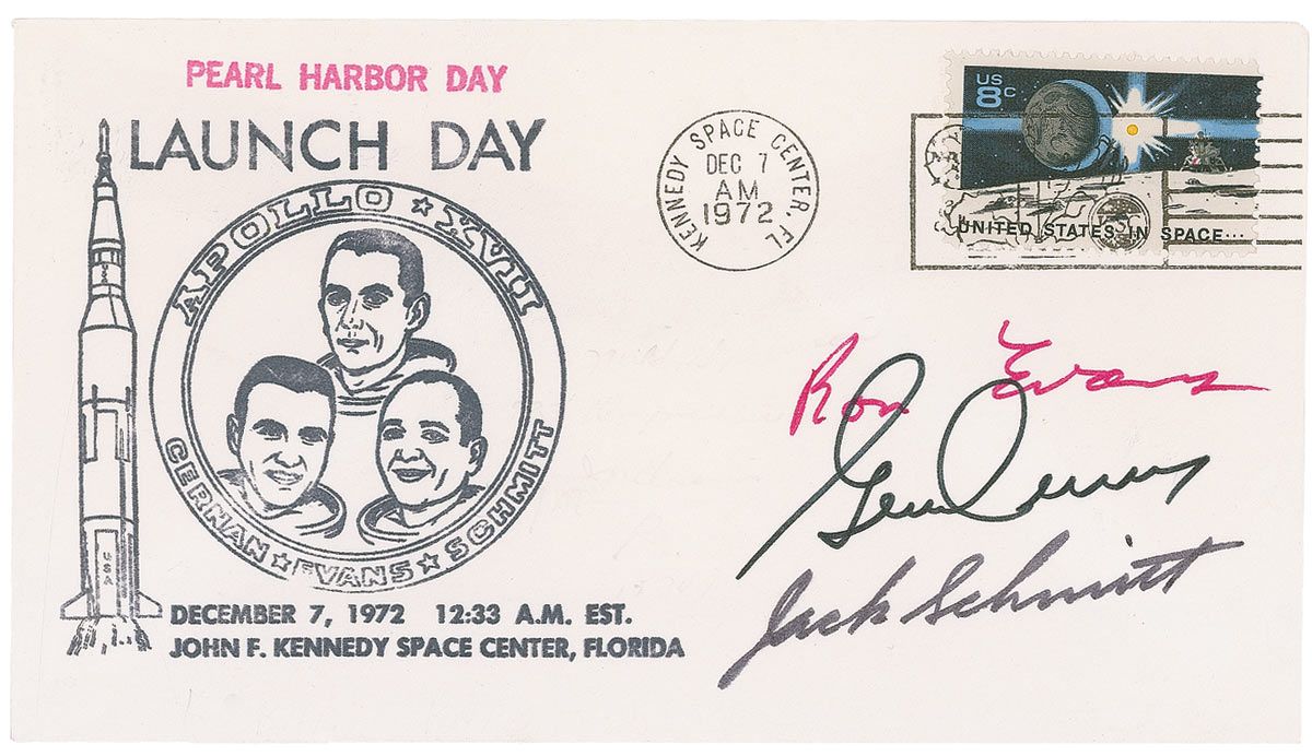 Apollo 17 Launch Day cover, signed in red felt tip by Ron Evans, and signed in black felt tip by Gene Cernan and [Harrison] Jack Schmitt. In fine condition, with light creasing.
