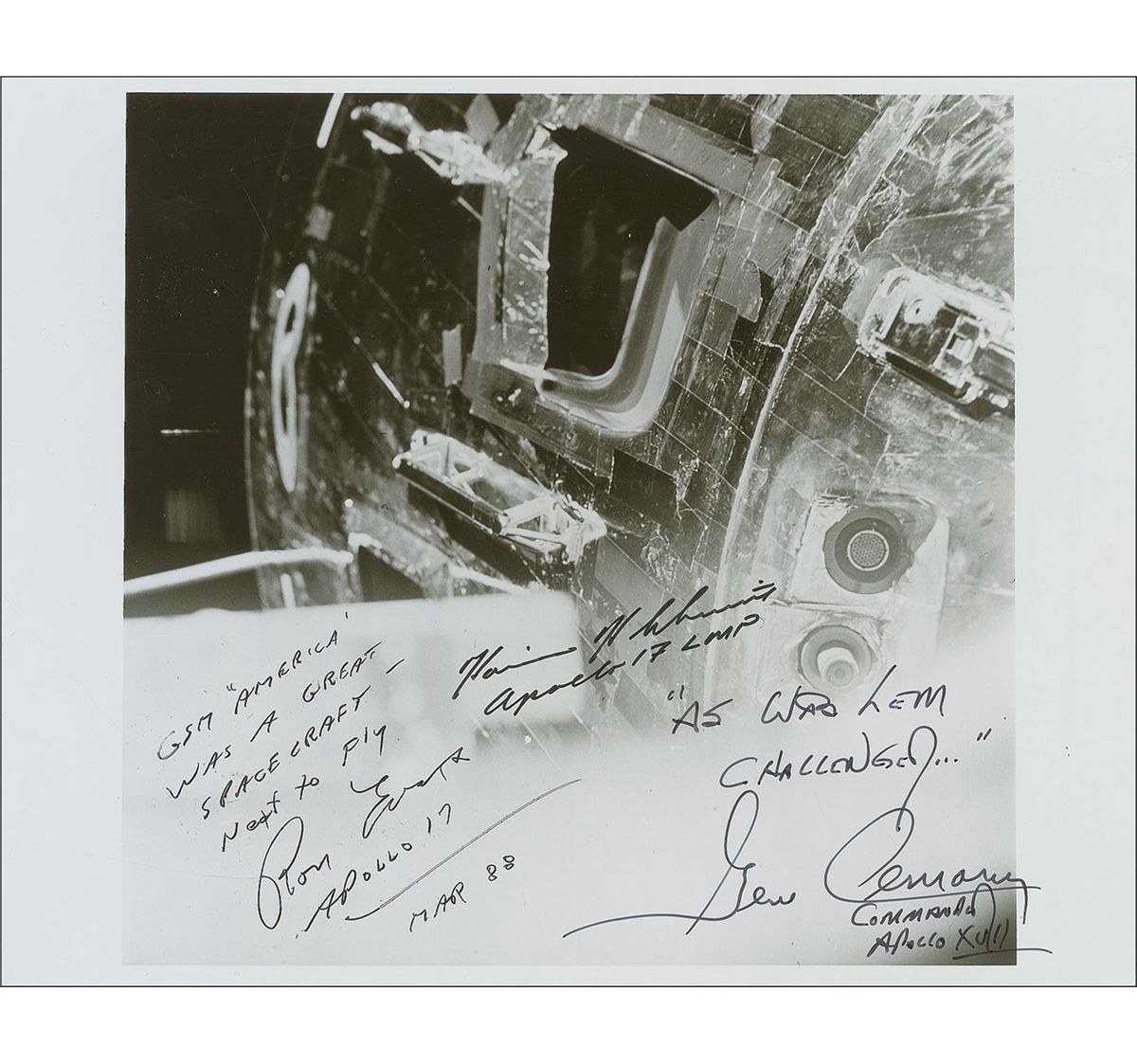 Glossy 10 x 8 NASA photo of the exterior of the command module, seen from the inside of the lunar module during the translunar coast, signed in black felt tip, “GSM ‘America’ was a great spacecraft—neat to fly. Ron Evans, Apollo 17, Mar 88,” “Harrison H. Schmitt, Apollo 17 LMP,” and “’As was LEM Challenger…’ Gene Cernan, Commander, Apollo XVII.” In fine condition, with a few light dings and creases.
