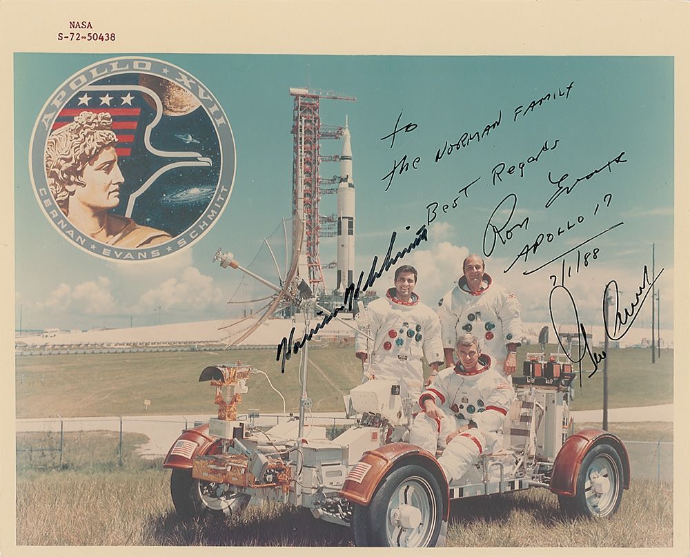 Color 10 x 8 NASA ‘red-numbered’ photo of the Apollo 17 crew posing with their lunar rover in front of the launch pad, signed and inscribed in black felt tip “To the Norman Family, Best regards, Ron Evans, Apollo 17, 7/1/88,” “Harrison Schmitt,” and “Gene Cernan.” In fine condition.