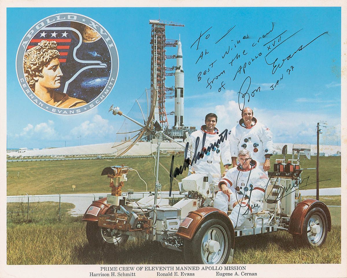 Color 10 x 8 NASA photo of the crew posing with their lunar rover, signed in black felt tip, “Gene Cernan” and “Jack Schmitt,” signed and inscribed “To Al—Best wishes from the crew of Apollo XVII, Ron Evans, Jan 77.” In very good condition, with scattered soiling to the right side, slight creasing to a few corner tips, and light brushing to part of the inscription.