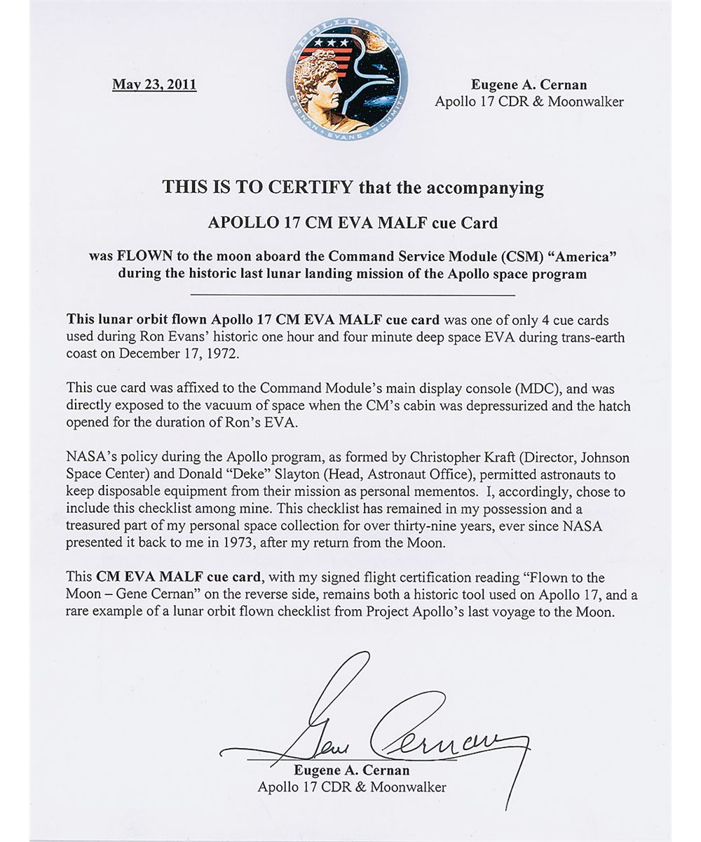 Flown double-sided extra-vehicular activity cue card, 3.5 x 9, flown to the moon on board Apollo 17. Card is labeled “CM EVA MALF” at the top, and was one of four cards used for reference during Ron Evans’s hour-long EVA during trans-Earth coast on December 17, 1972. The card bears two pieces of Velcro on each side and was affixed to the Command Module’s main display console during his EVA, where it was exposed to the vacuum of space when the cabin was depressurized and the hatch opened for the duration of Evans’s spacewalk. Reverse is signed in blue ink, “Flown to the Moon, Gene Cernan.” In fine condition. Originates from Cernan’s personal collection and is accompanied by his signed letter of provenance. An awe-inspiring artifact from man’s last trip to the moon.