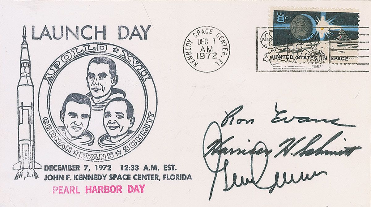 Apollo 17 launch day postal cover with a cachet honoring the mission launch, and bearing a December 7, 1972, Kennedy Space Center cancellation, signed in black felt tip by Ron Evans, Harrison Schmitt, and Gene Cernan. In very fine condition.