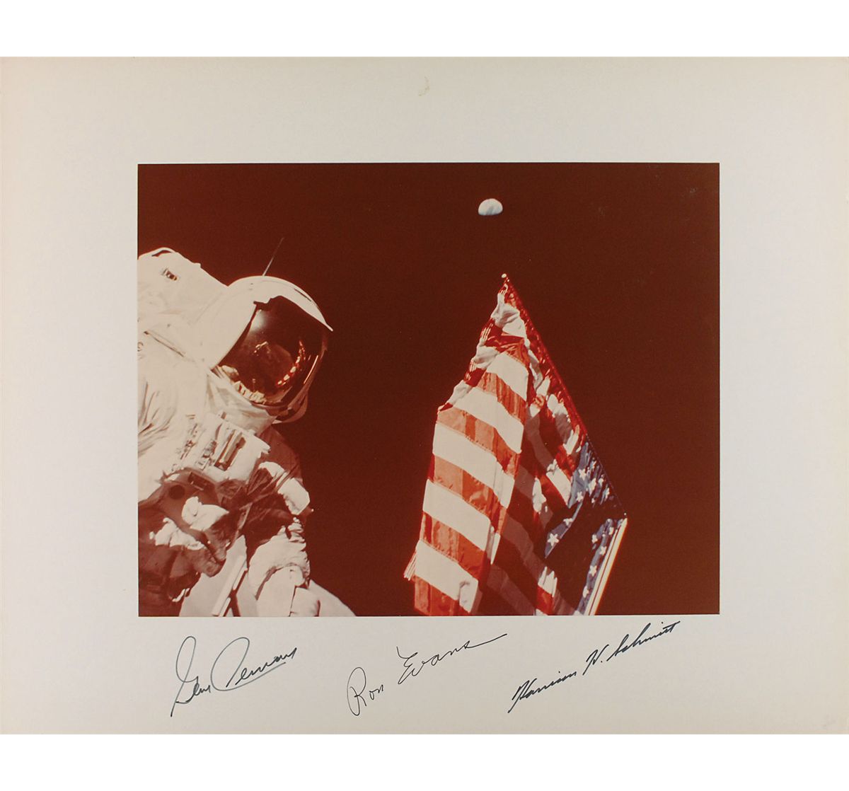 Color glossy 13.5 x 10.5 photo of Harrison Schmitt posing next to the American flag on the lunar surface, the earth visible behind him, affixed to its 20 x 16 mount, signed on the mount in black felt tip by Gene Cernan, Ron Evans, and Harrison Schmitt. In fine condition.