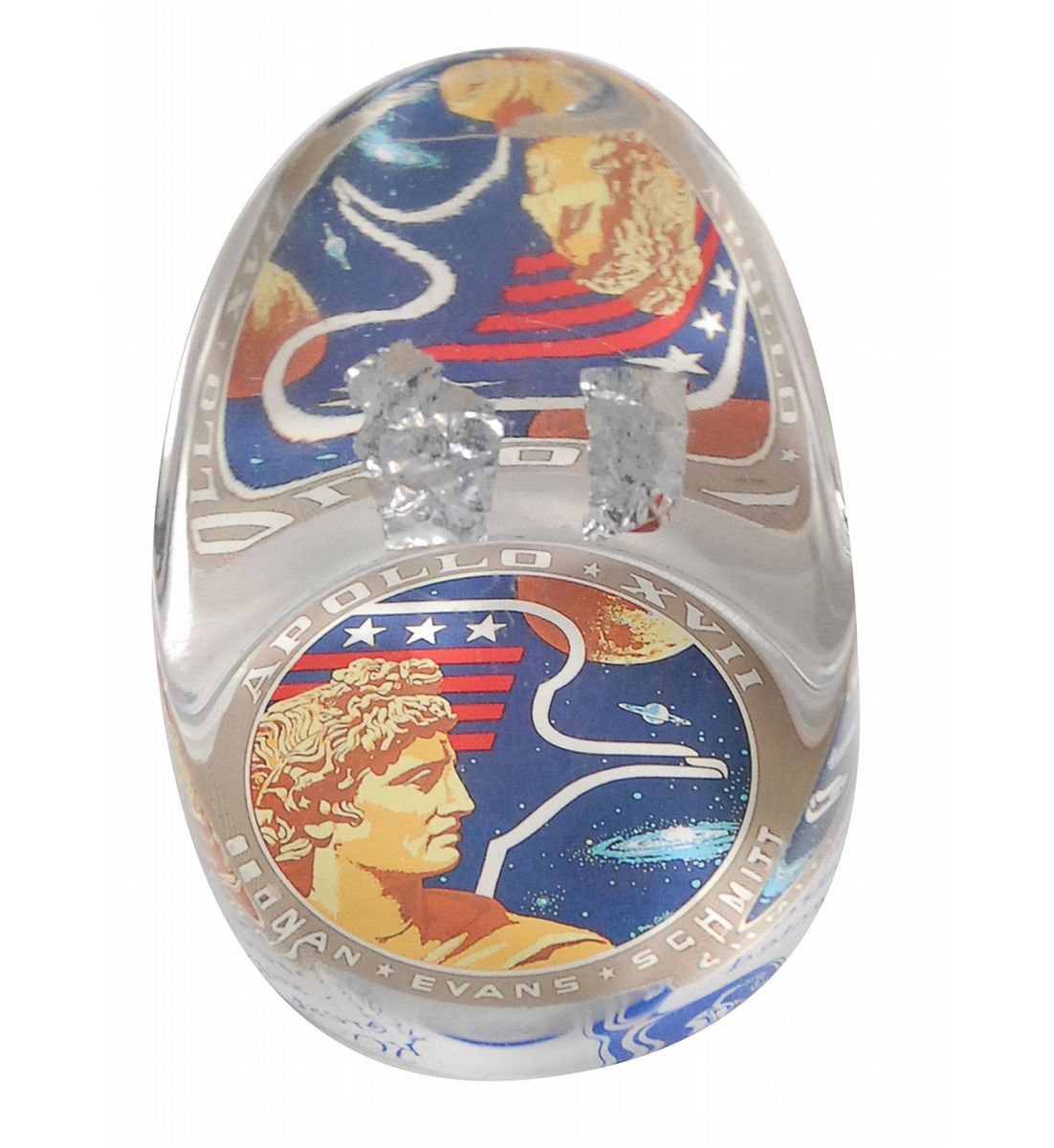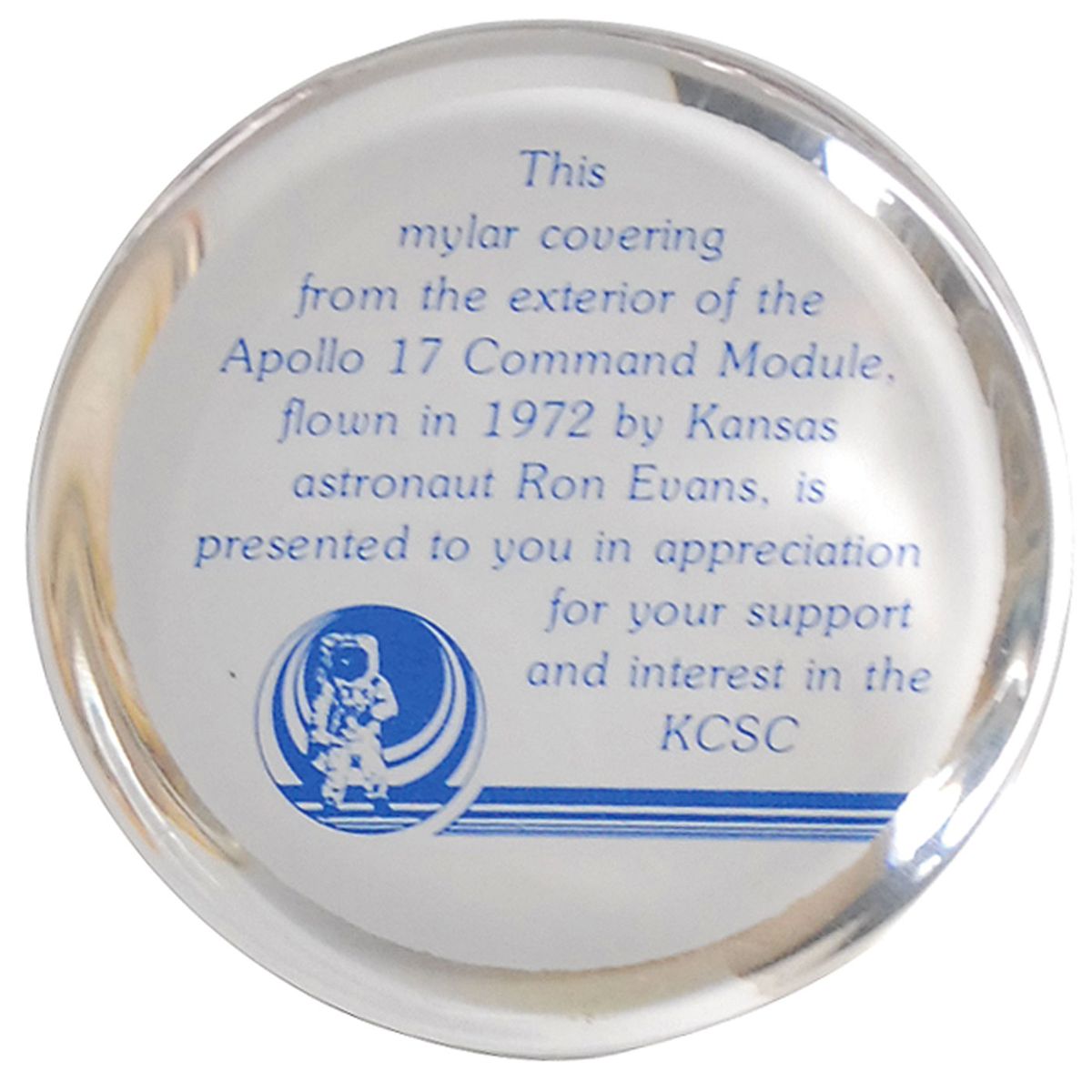 Two small flown pieces of Mylar covering from the exterior of the Apollo 17 command module. Fragments are housed in a circular Lucite display with a presentation printed on the bottom which reads, “This mylar covering from the exterior of the Apollo 17 Command Module, flown in 1972 by Kansas astronaut Ron Evans, is presented to you in appreciation for your support and interest in the KCSC.” In fine condition.
